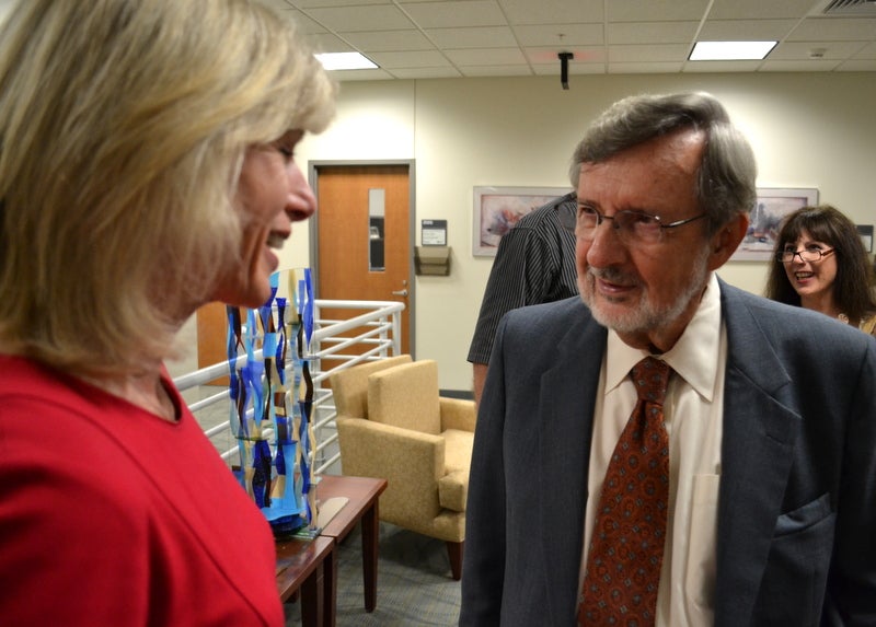 David Obey speaks to Democratic gubernatorial candidate Mary Burke at the dedication ceremony of the former congressman's new resource center. Photo: Glen Moberg/WPR News.