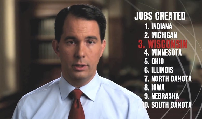In the new ad, Walker informs viewers that the latest job numbers are in, then reads off a list of Midwest states that ranks behind Wisconsin. The governor reaches this conclusion: “That means we ranked third in the Midwest.”