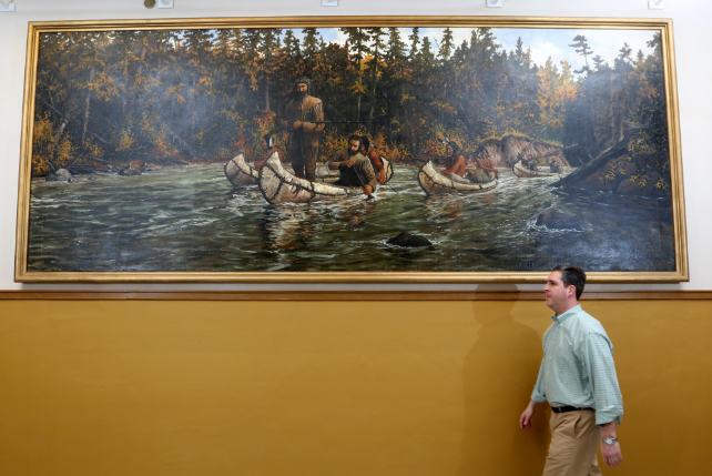 Commissioned by the Works Progress Administration in 1936, the paintings -- made by Wisconsin-born artist Cal Peters -- depict a French fort and fur traders with Native Americans canoeing the Red Cedar River. At 6 feet tall and up to 18 feet wide, the murals command attention in the corridors of Harvey Hall.