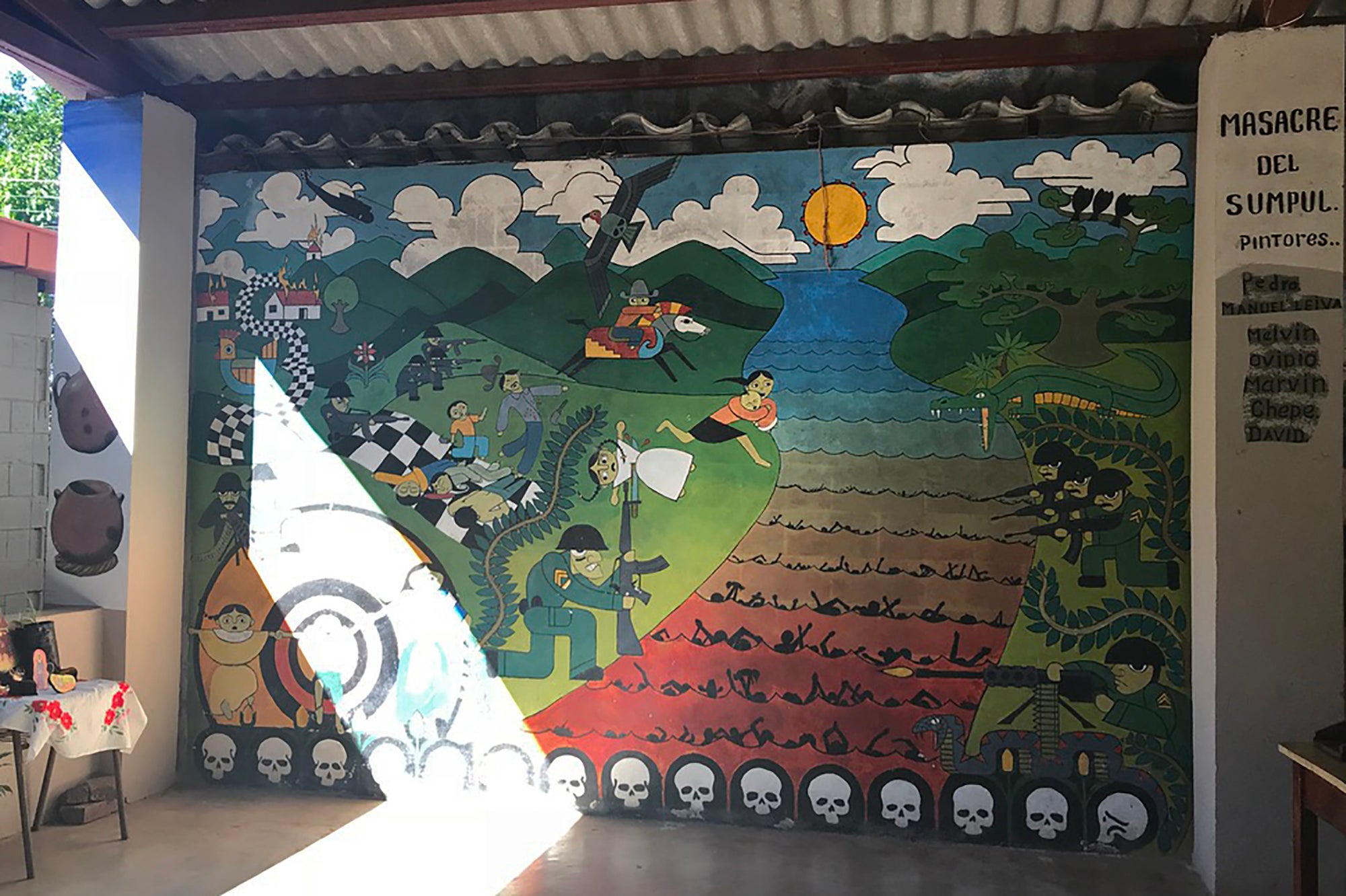 [[{“fid”:”1528171″,”view_mode”:”embed_portrait”,”fields”:{“alt”:”Rosa Rivera y Rivera stands in front of photographs from the Salvadoran Civil War.”,”title”:”Rosa Rivera y Rivera stands in front of photographs from the Salvadoran Civil War.”,”class”:”media-element file-embed-portrait media-wysiwyg-align-right”,”data-delta”:”2″,”format”:”embed_portrait”,”alignment”:”right”,”field_image_caption[und][0][value]”:”%3Cp%3EMember%20of%20the%20Arcatao%20Historical%20Memory%20Committee%2C%20Rosa%20Rivera%26nbsp%3BRivera%20stands%20in%20front%20of%20photographs%20from%20the%20Salvadoran%20Civil%20War.%26nbsp%3B%3Cem%3EPhoto%20courtesy%20of%26nbsp%3BXiaolei%20Tang%3C%2Fem%3E%3C%2Fp%3E%0A”,”field_image_caption[und][0][format]”:”full_html”,”field_file_image_alt_text[und][0][value]”:”Rosa Rivera Rivera stands in front of photographs from the Salvadoran Civil War.”,”field_file_image_title_text[und][0][value]”:”Rosa Rivera Rivera stands in front of photographs from the Salvadoran Civil War.”},”type”:”media”,”field_deltas”:{“2”:{“alt”:”Rosa Rivera y Rivera stands in front of photographs from the Salvadoran Civil War.”,”title”:”Rosa Rivera y Rivera stands in front of photographs from the Salvadoran Civil War.”,”class”:”media-element file-embed-portrait media-wysiwyg-align-right”,”data-delta”:”2″,”format”:”embed_portrait”,”alignment”:”right”,”field_image_caption[und][0][value]”:”%3Cp%3EMember%20of%20the%20Arcatao%20Historical%20Memory%20Committee%2C%20Rosa%20Rivera%26nbsp%3BRivera%20stands%20in%20front%20of%20photographs%20from%20the%20Salvadoran%20Civil%20War.%26nbsp%3B%3Cem%3EPhoto%20courtesy%20of%26nbsp%3BXiaolei%20Tang%3C%2Fem%3E%3C%2Fp%3E%0A”,”field_image_caption[und][0][format]”:”full_html”,”field_file_image_alt_text[und][0][value]”:”Rosa Rivera Rivera stands in front of photographs from the Salvadoran Civil War.”,”field_file_image_title_text[und][0][value]”:”Rosa Rivera Rivera stands in front of photographs from the Salvadoran Civil War.”}},”link_text”:false,”attributes”:{“alt”:”Rosa Rivera Rivera stands in front of photographs from the Salvadoran Civil War.”,”title”:”Rosa Rivera Rivera stands in front of photographs from the Salvadoran Civil War.”,”class”:”media-element file-embed-portrait media-wysiwyg-align-right”,”data-delta”:”2″}}]]”It’s really hard for me to return,” she said. “When I lived there, I lived with my parents, siblings, cousins, aunts and uncles, and they were all murdered in the ’80s. They were all killed.”