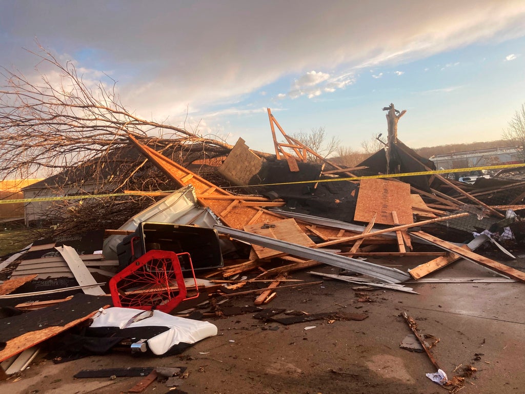 One tornado veered just west of Iowa City, home to the University of Iowa. Video from KCRG-TV showed toppled power poles and roofs ripped off an apartment building in the suburb of Coralville and significantly damaged homes in the city of Hills.