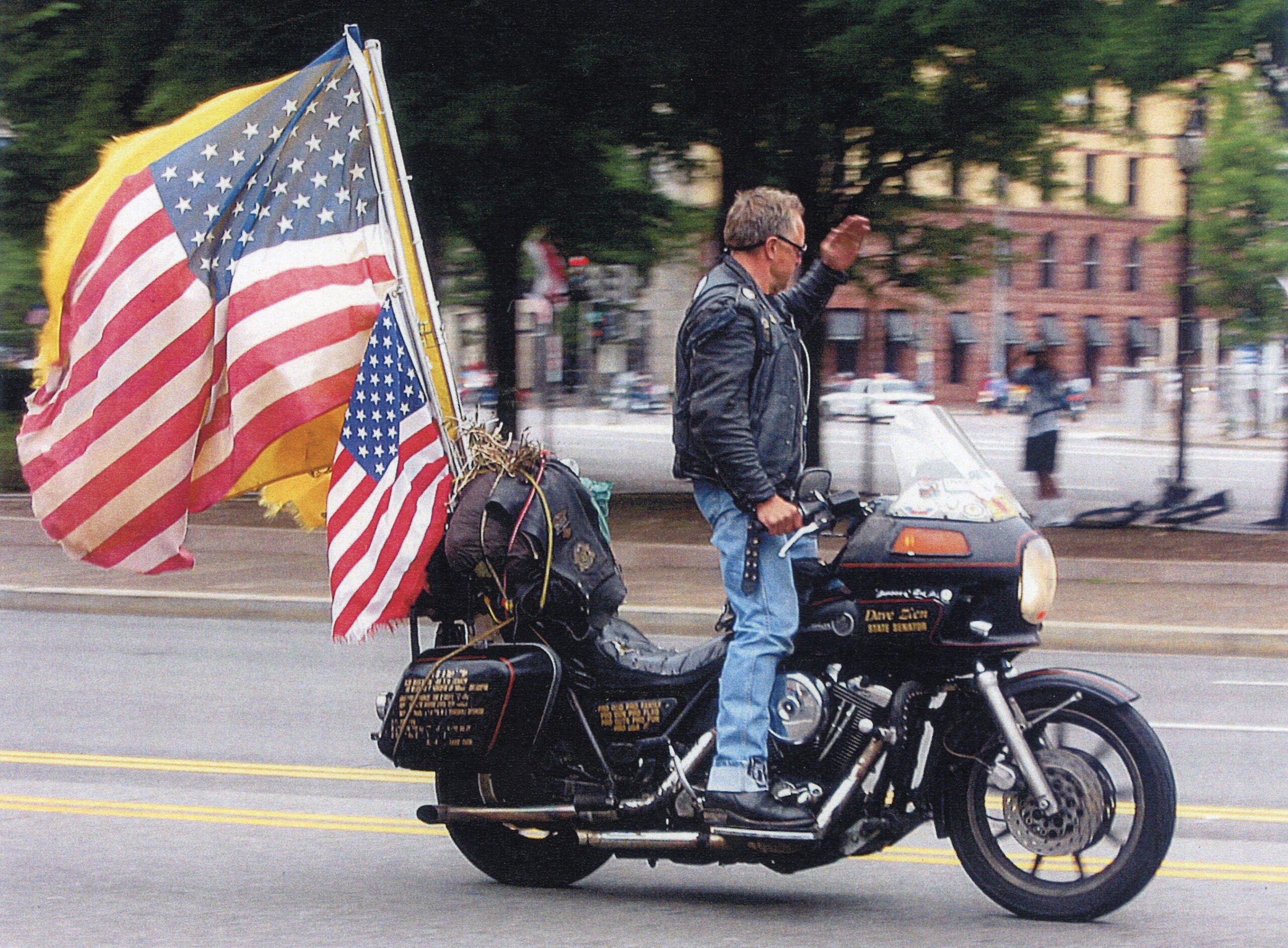Helmet laws were a big thing in the ‘80s and ‘90s in this state. He went on to the state Legislature from 1988 to 2006. He’s a very nice guy. He’s quite the character. You will never miss him if he rides by.