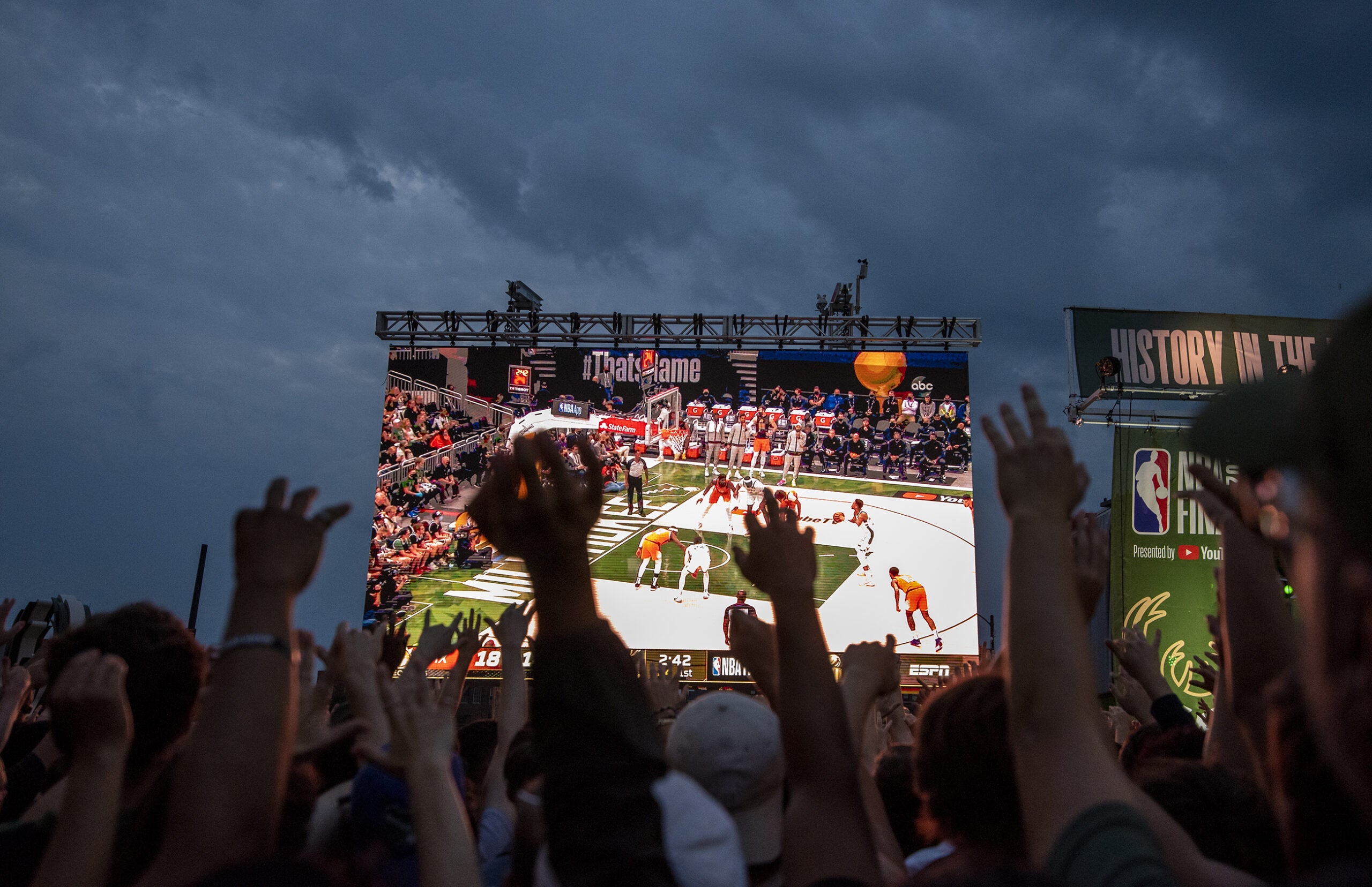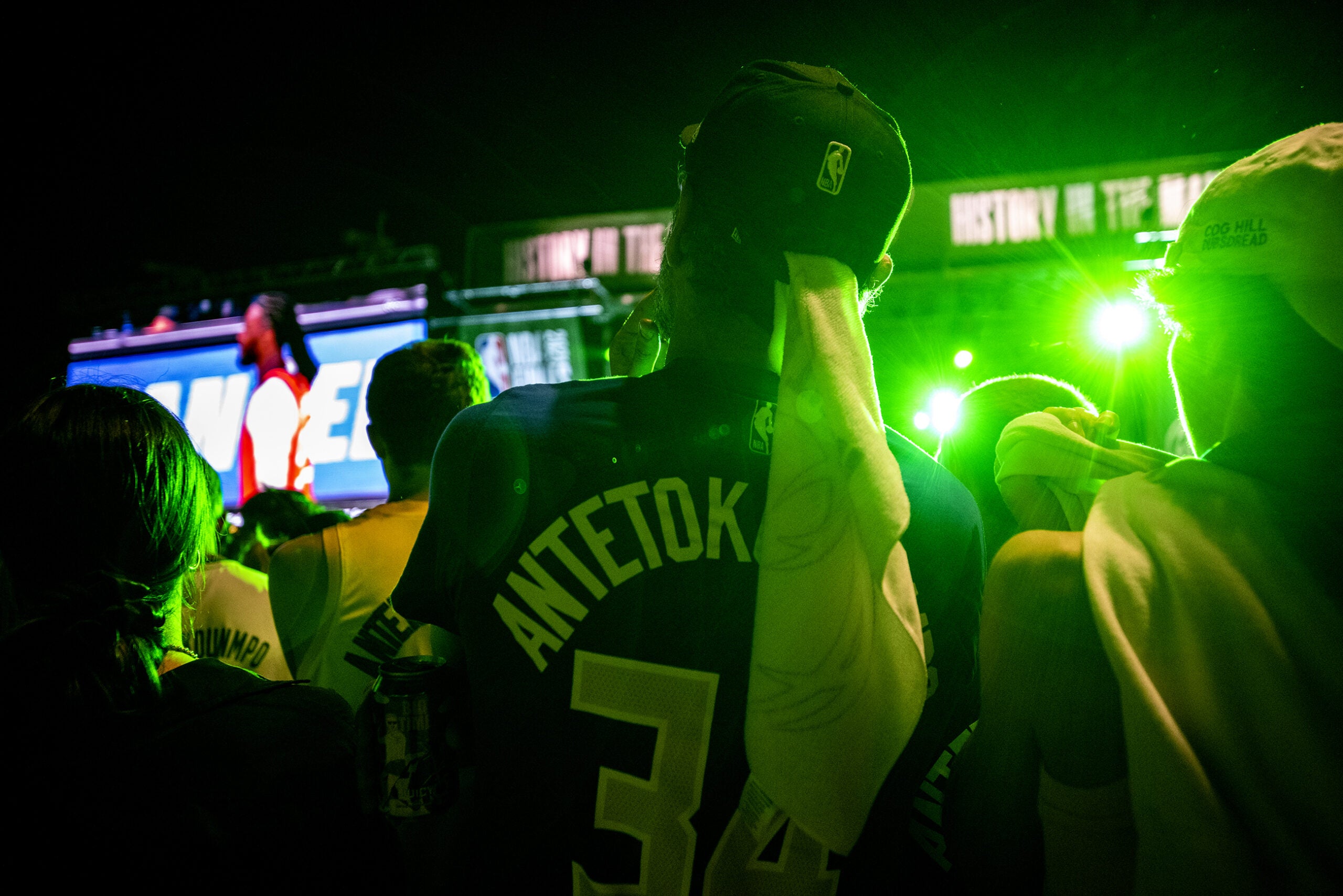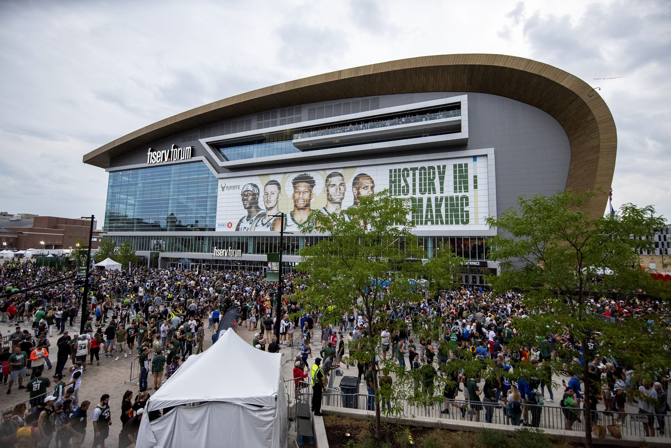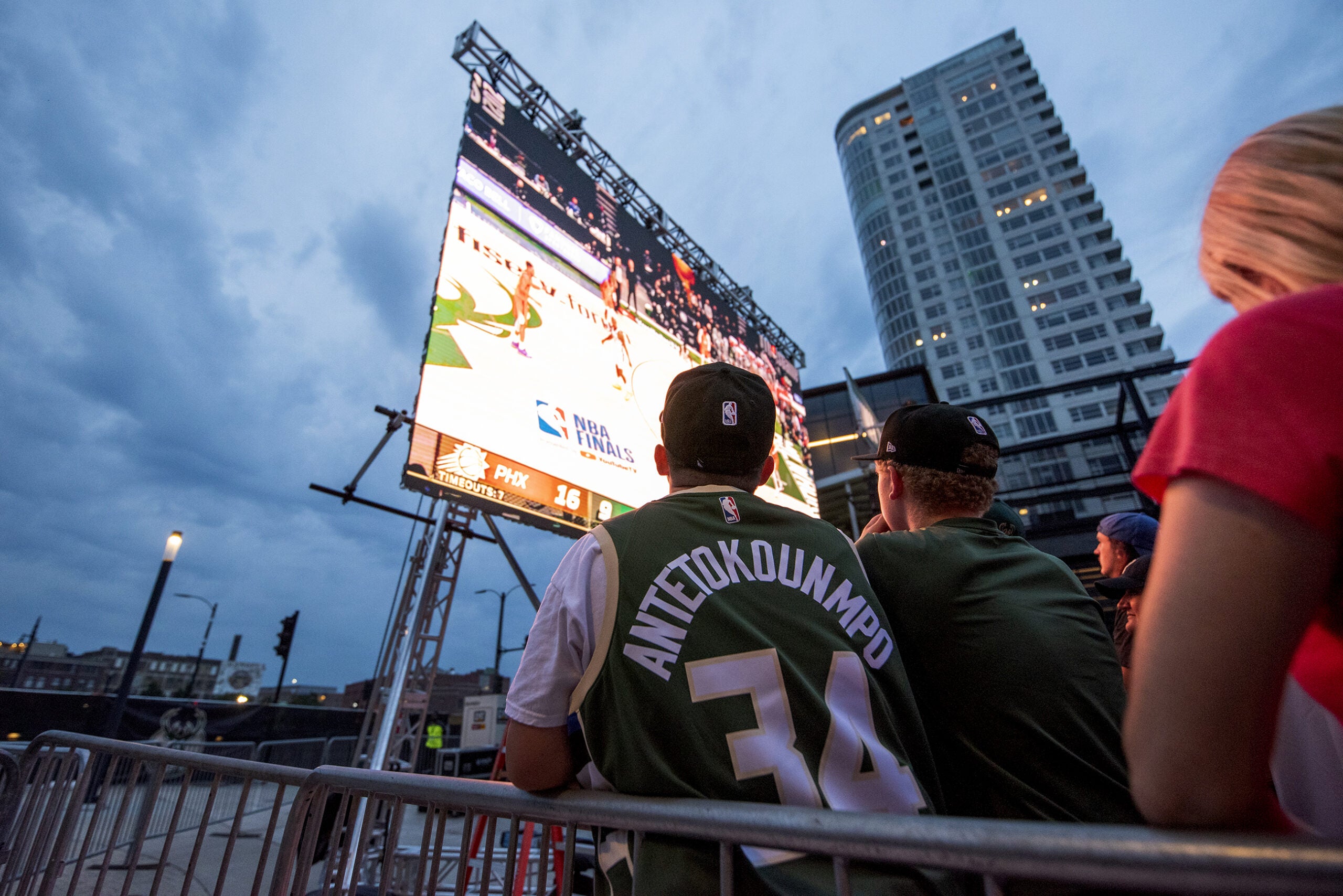 The Milwaukee Bucks defeated the Phoenix Suns 109-103 to tie the series in the fourth game of the NBA Finals. Fans gathered outside the Fiserv Forum in the Deer District to watch the game being played inside the arena.