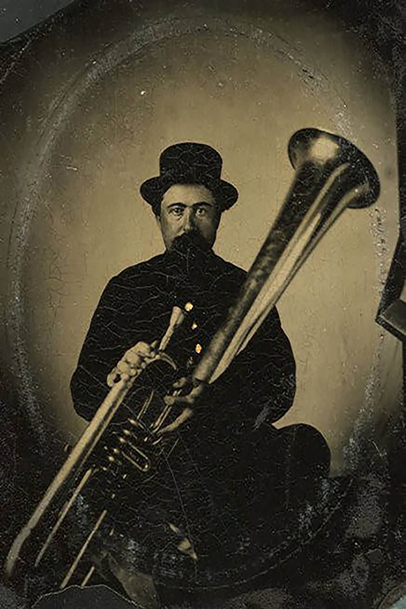 In this 1861 tintype portrait, Charles C. Stone of Brodhead, Wisconsin, holds a tuba.