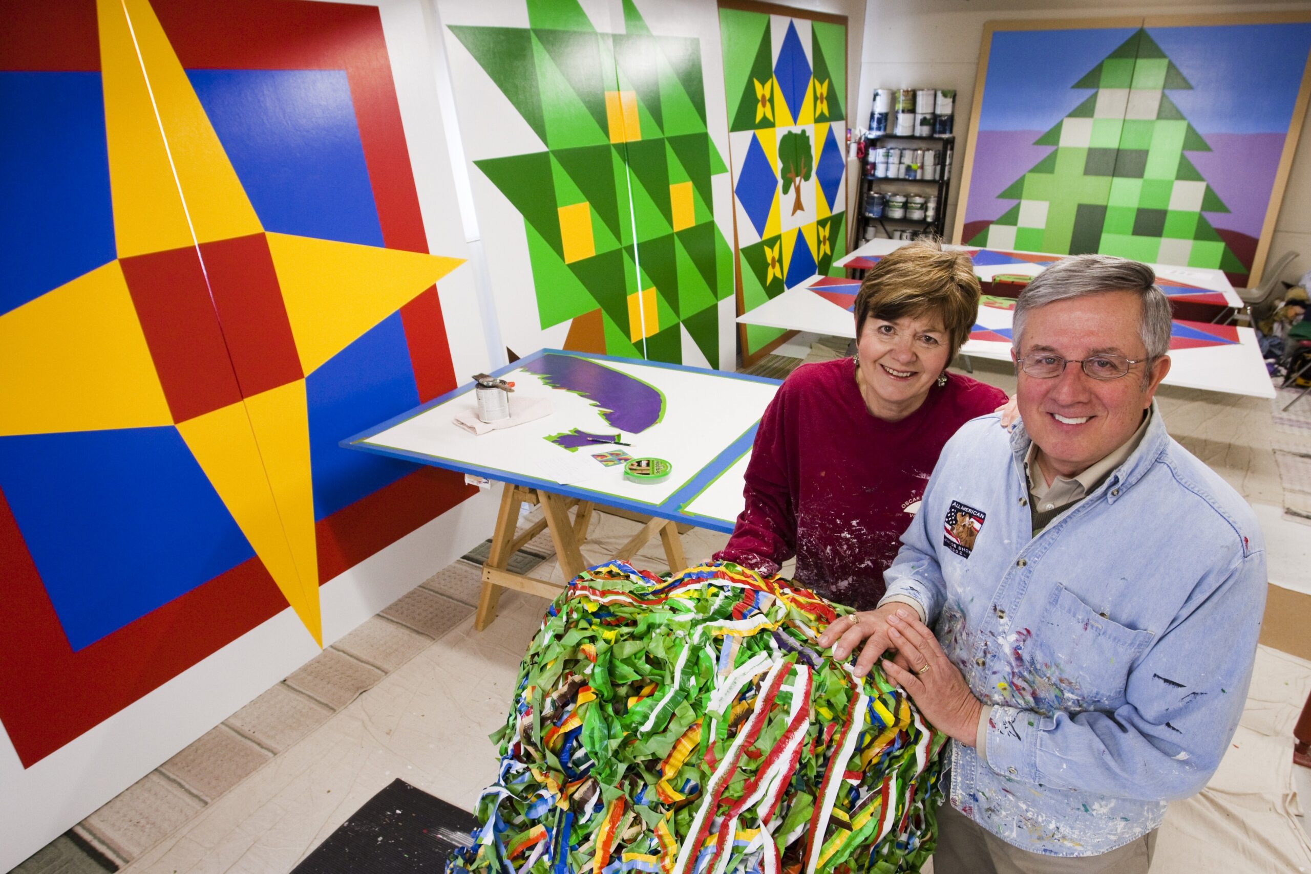 The creators of Shawano County’s quilts are Jim and Irene Leuenberger. For the last nine years, the couple has voluntarily painted the artwork in the basement of the Shawano Country Chamber of Commerce.