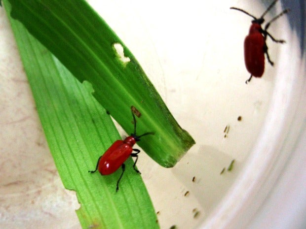 This beetle destroys native and cultivated lilies. However, it only reproduces and develops on fritillaries and true lilies, which include Turk’s cap, tiger, Easter, Asiatic and Oriental varieties, and native lilies such as the wood lily. True lilies do not include canna, calla or daylilies.