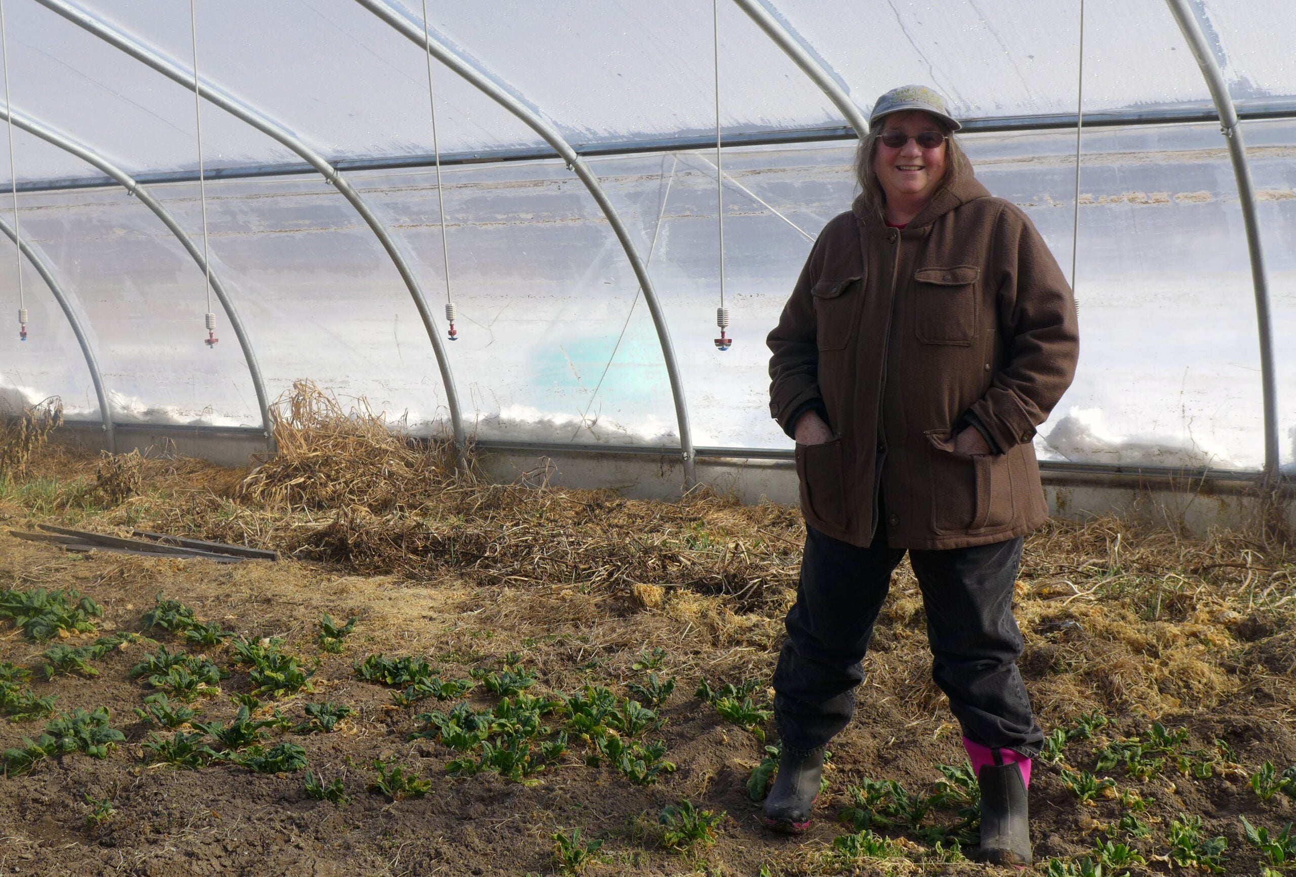 Harriet Behar uses a high tunnel on her farm near Gays Mills to grow organic spinach. Similar to a greenhouse, the high tunnel has heavy translucent plastic which insulates the plants from the cold. She can get around seven cuttings of spinach over the winter, a pretty productive crop for her farm.