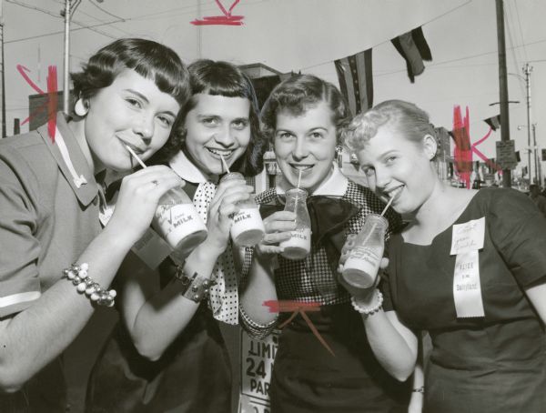Wisconsin got its own dairy royalty in 1948 with the launch of Alice in Dairyland, a replacement for the short-lived Wisconsin Dairy Queen. Four Alice candidates drink bottles of milk in the above image from 1956. Selected each May, Alice begins her reign each year in June as Wisconsin’s agricultural ambassador (despite the name, she’s more than just dairy).