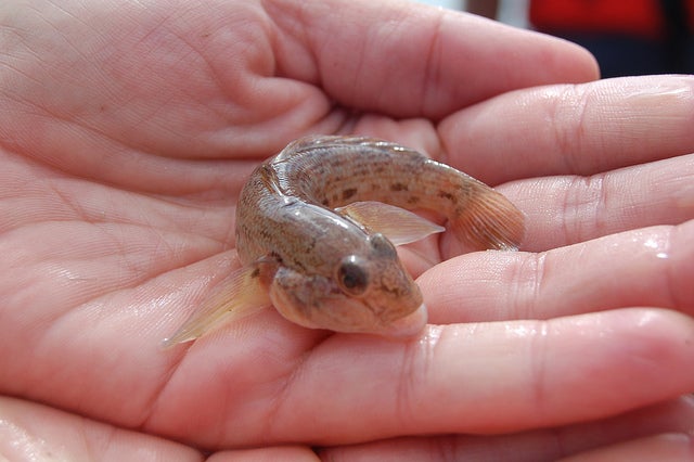 Round gobies are grayish fish with frog-like eyes, no bigger than 5 or 6 inches.