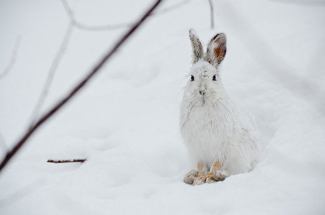 For raptors and coyotes, snowshoe hares make an easy meal. In the summer, the big-footed animals look like brown rabbits, while in the winter, their fur turns white so they can hide in the snow.