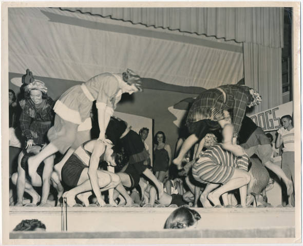 Ripon College students leap frog across the stage in the 1951 Ver Adest performance at Ripon College.