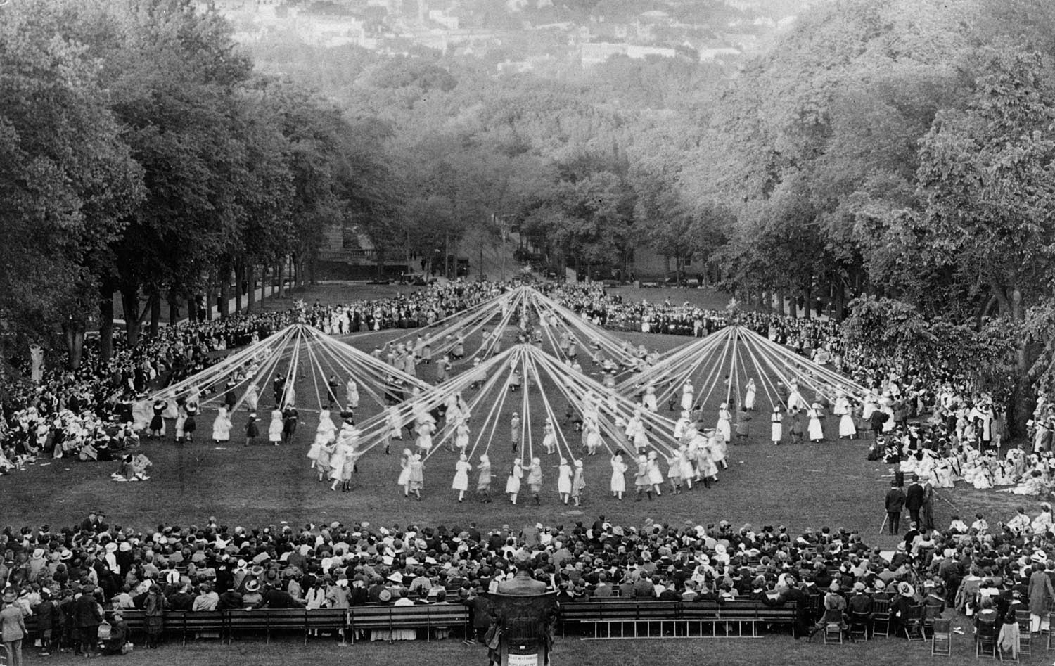 In the above image, students dance around the Maypole at the May Fete on Bascom Hill around 1917. For many years, the school year concluded with the May Fete, an elaborate program of singing, dancing and celebrating outdoors. The Fete was discontinued when the nation entered World War I.