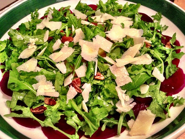 In a bowl, toss the beets with salt, pepper and 2 Tbs. of the olive oil. Wrap the beets in a large piece of aluminum foil and place on a baking sheet. Roast the mushrooms until browned and softened, about 15 minutes. Roast the beets until tender when pierced with a knife, about 30 minutes. Remove from the oven. When the beets are cool enough to handle, peel them and cut in half.