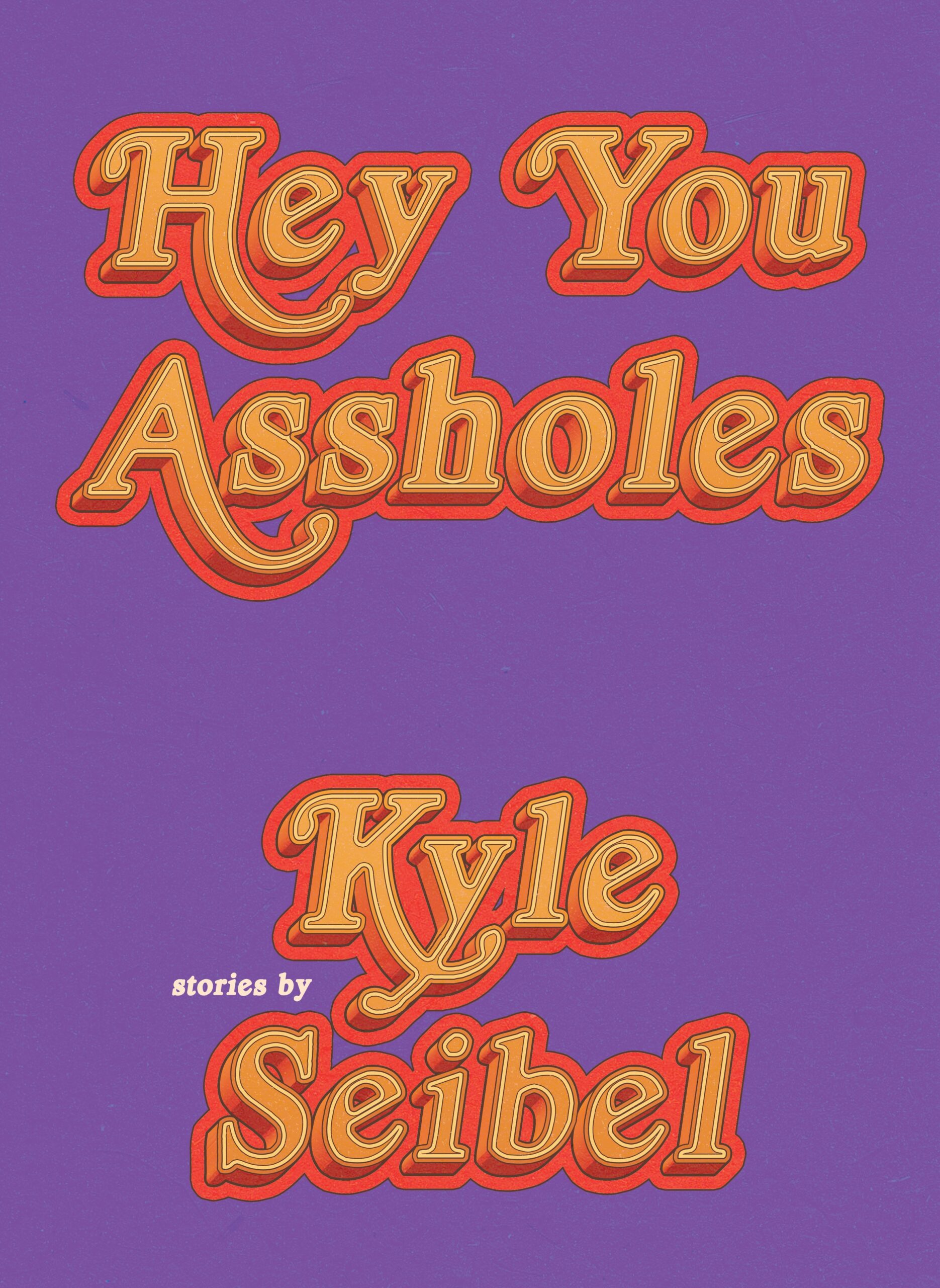 Purple book cover with bold, retro orange and yellow text reading Hey You Assholes and stories by Kyle Seibel.