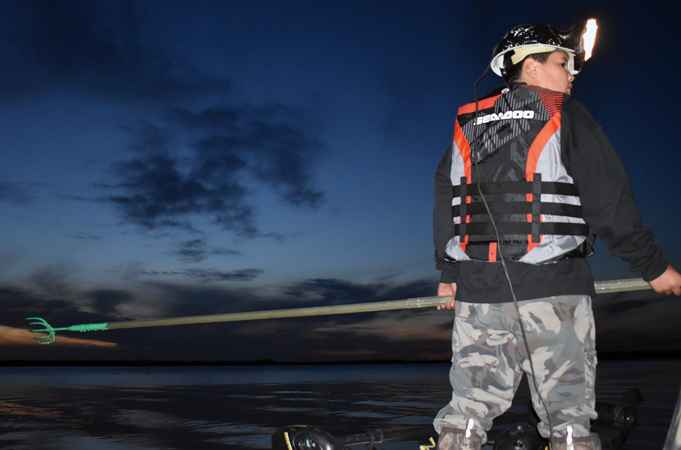 Ganebik Johnson, 11, harvests walleye with an aluminum spear on May 7, 2022, at Little Trout Lake in northern Wisconsin. Danielle Kaeding/WPR