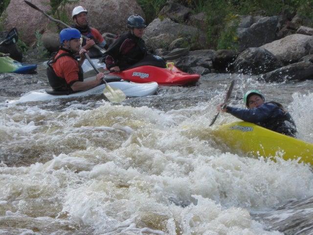 The roar of water racing over rapids drowns out the shouts of instructors, as helmeted paddlers perform tricks at the base of a small waterfall.