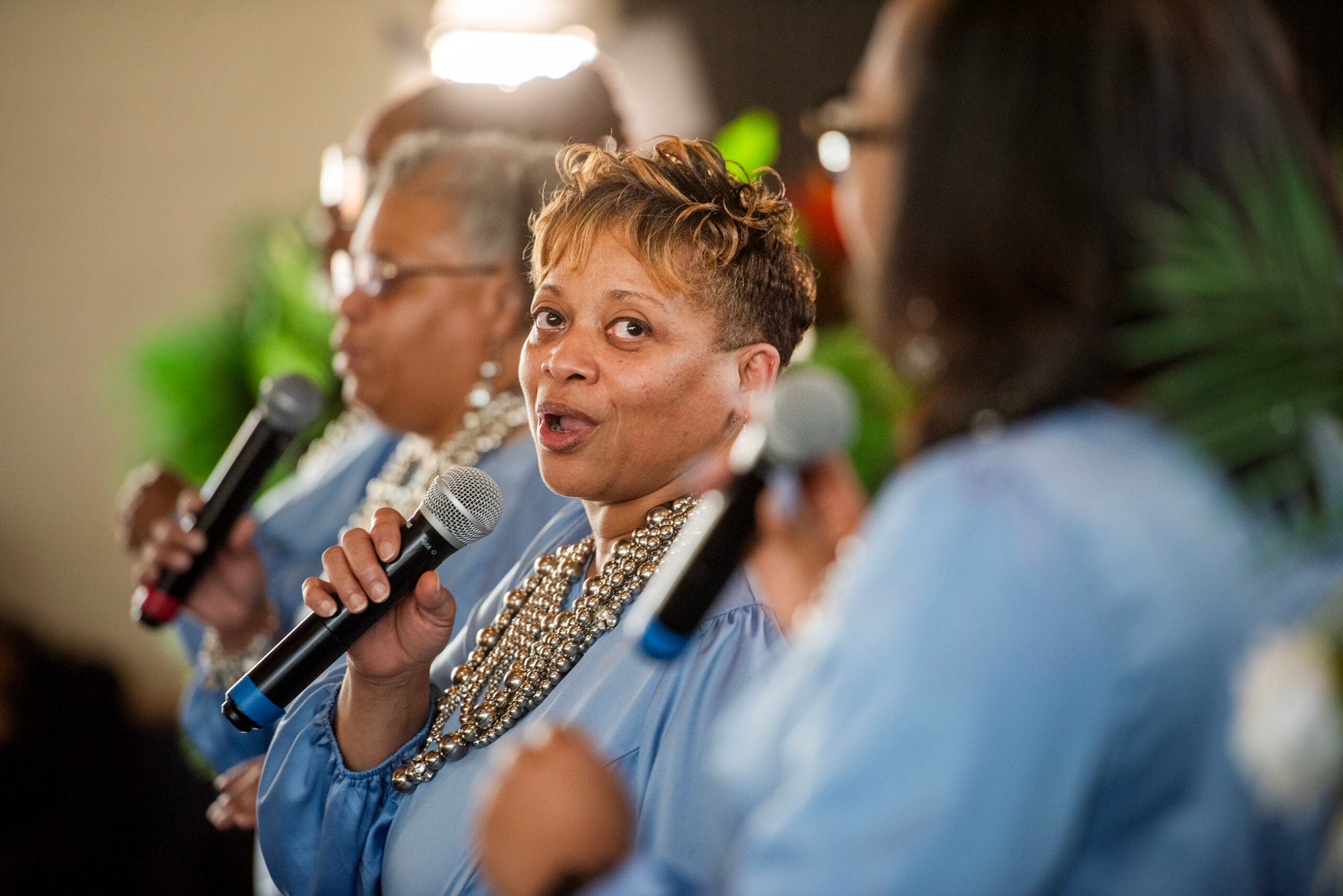 Host Kate Archer Kent: First thing’s first: This gospel troupe has a deep relationship with God. They show it when they are in perfect harmony at the altar of Baptist churches. They show it after a performance — decked out in matching baby blue dresses — sitting around a table in the church basement. As we are now. Also, most of them are related.