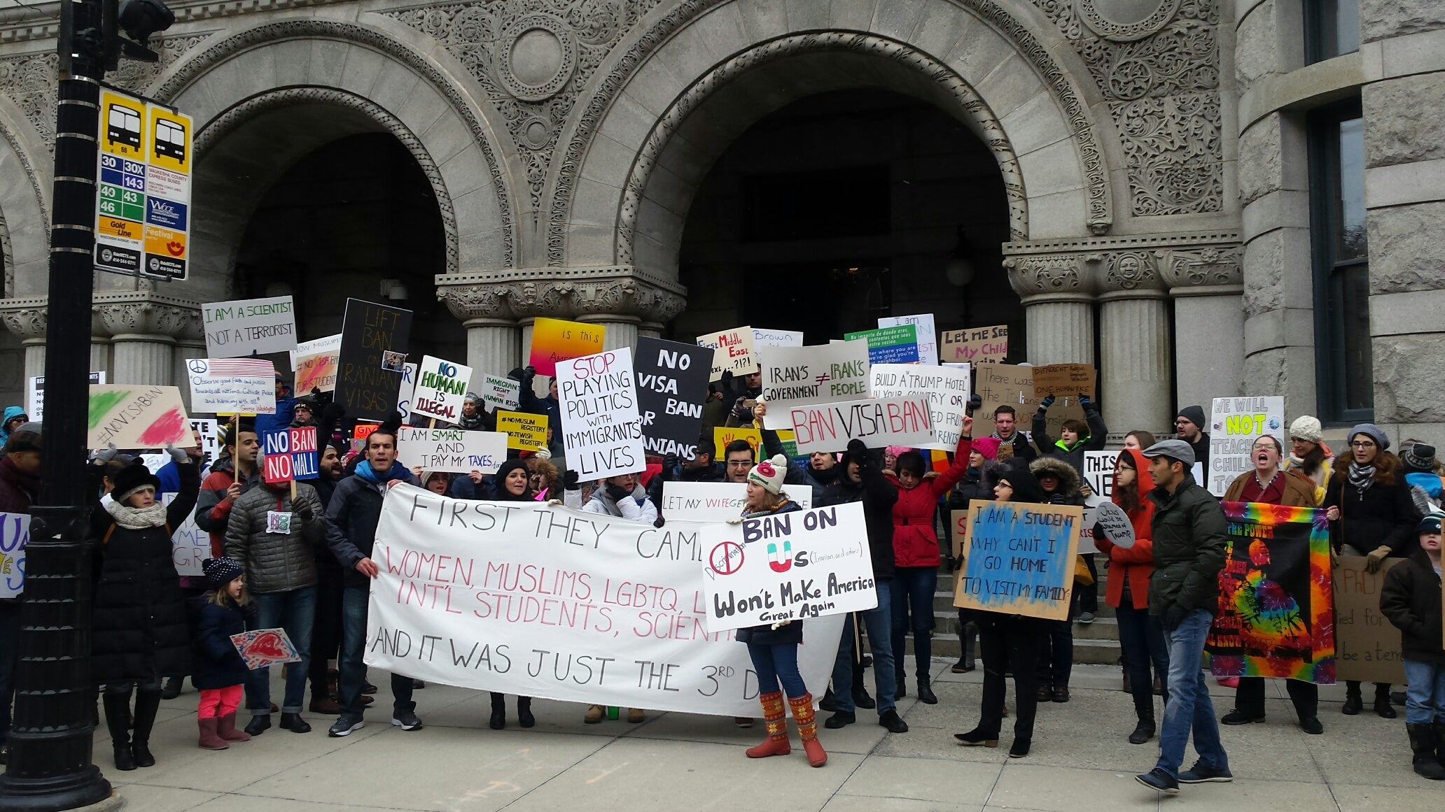 On Saturday in downtown Milwaukee, about 150 people protested the president’s order outside the city’s federal courthouse. Demonstrations against the executive occurred over the weekend around the U.S.