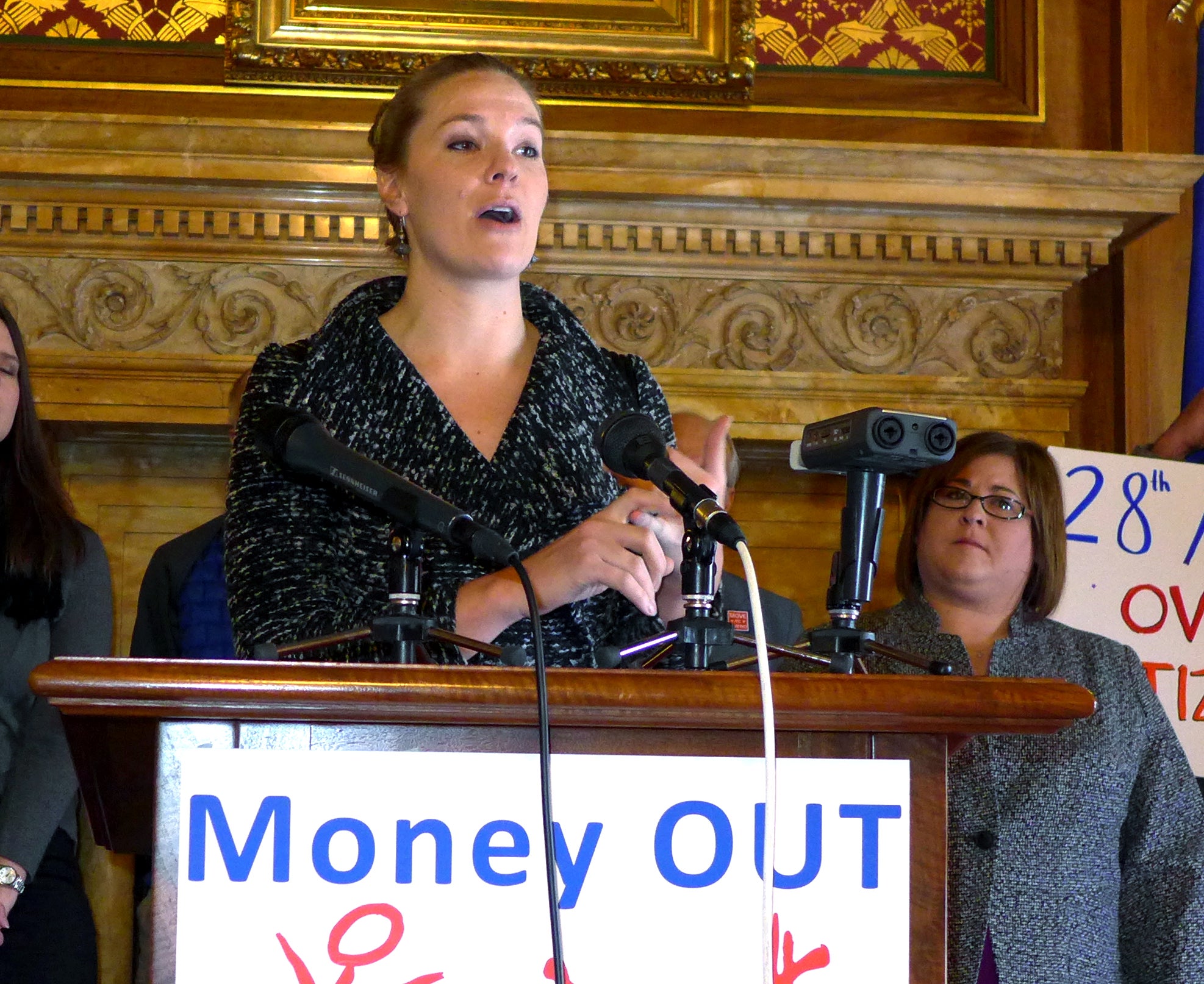 Dana Schultz of the coalition Money Out Voters In speaks in the state Capitol on Wednesday as state Rep. Lisa Subeck looks on. Photo: Gilman Halsted/WPR.