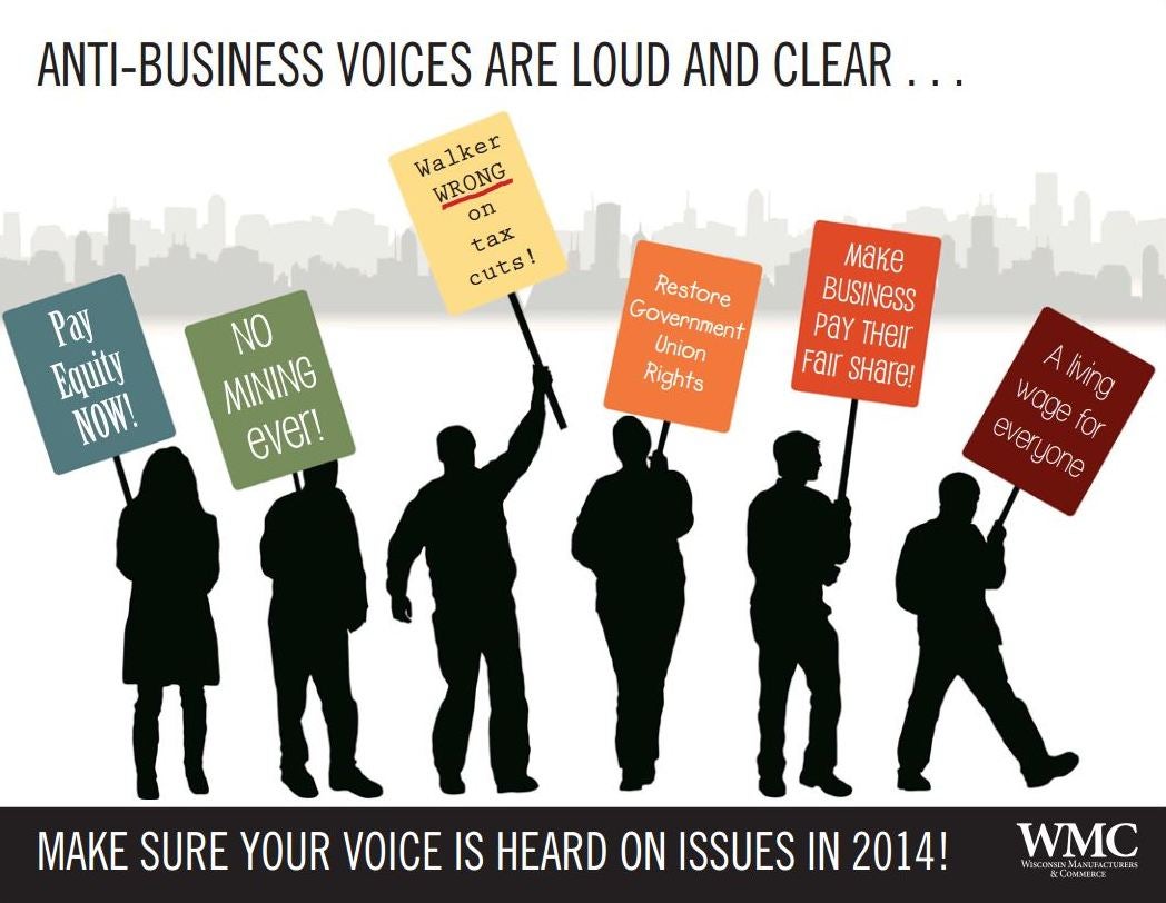 The comments in question are on the cover of a Wisconsin Manufacturers and Commerce fundraising brochure for its members. The words “Anti-business voices are loud and clear…” hover over silhouettes of protesters holding signs, one of which reads “Pay Equity Now!”