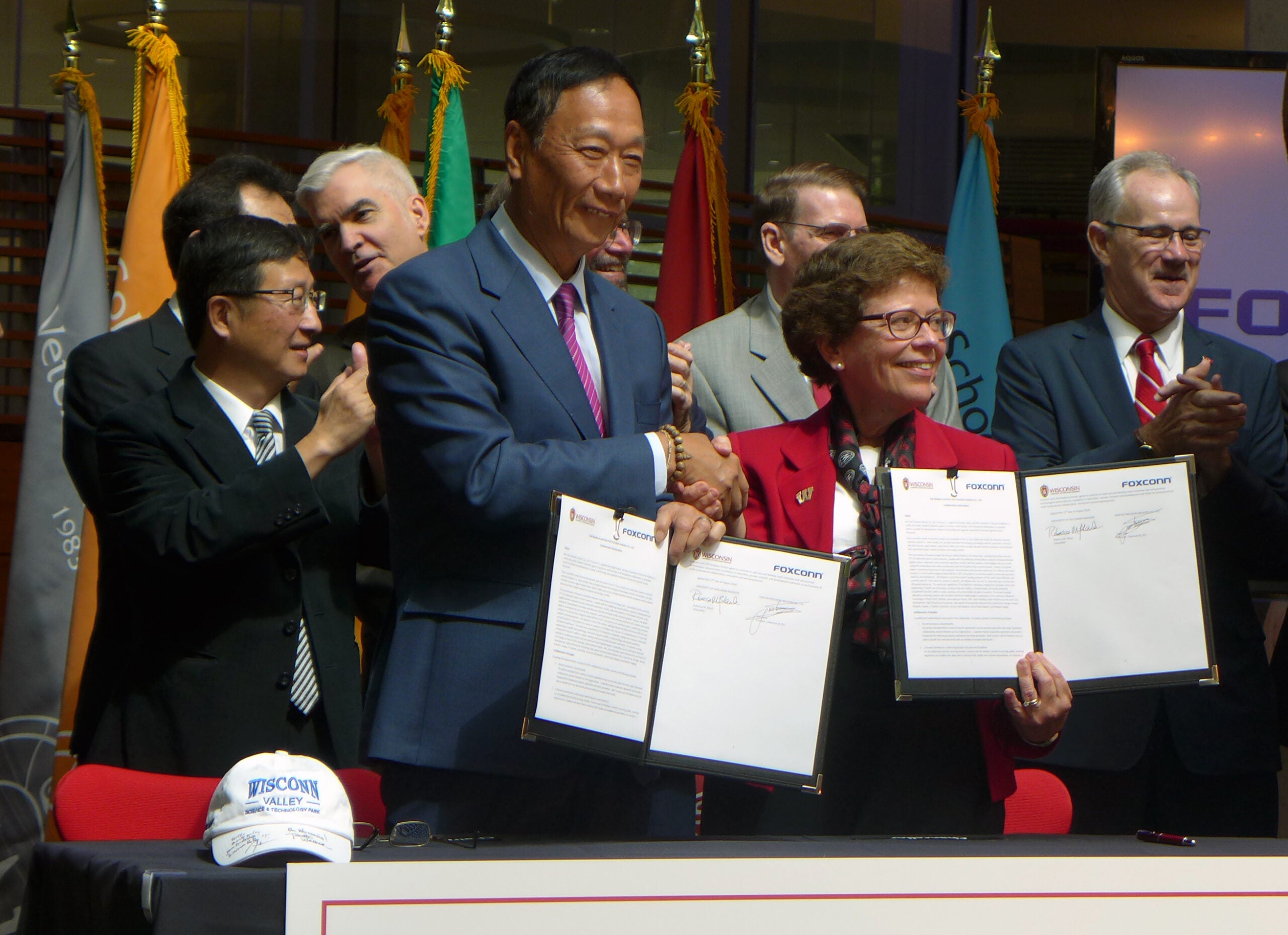 Foxconn CEO Terry Gou and UW-Madison Chancellor Rebecca Blank signed an agreement that also calls for Foxconn and the university to create a science and technology institute on the UW-Madison campus that will work closely with Foxconn’s facilities in southeast Wisconsin.