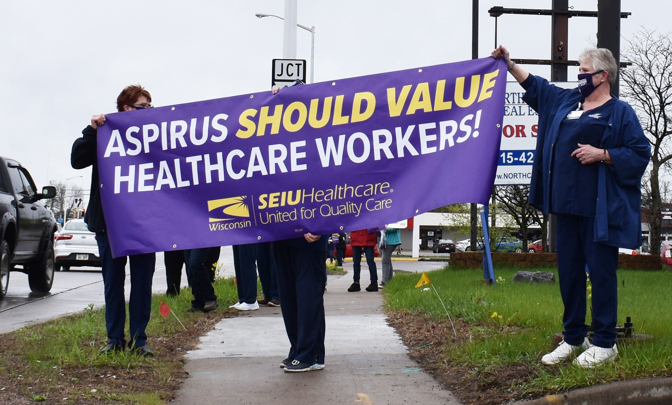 Ahead of a new round of contentious contract negotiations that restart Wednesday, a group of workers and supporters rallied at a busy intersection with signs urging the health system Aspirus, which owns Aspirus Riverview Hospital, to value its workers.