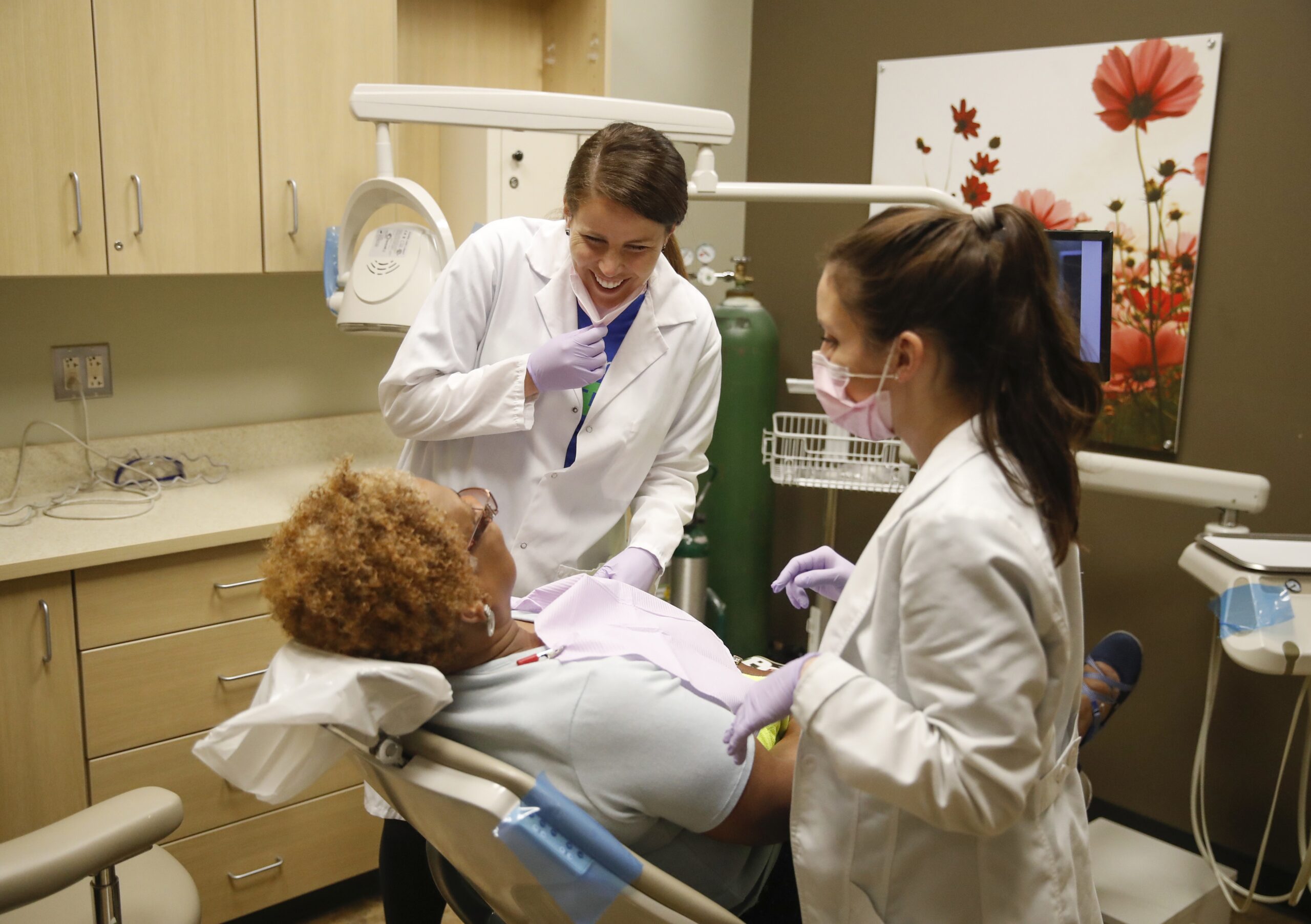 Dentists, Dr. Abigail Brier and Dr. Kristen Ramirez, enjoy a moment with patient Carolyn Foster during Aspen Dental Day of Service on Saturday, June 9, 2018 in Bloomingdale, Ill. Ross Dettman/AP Images for Aspen Dental