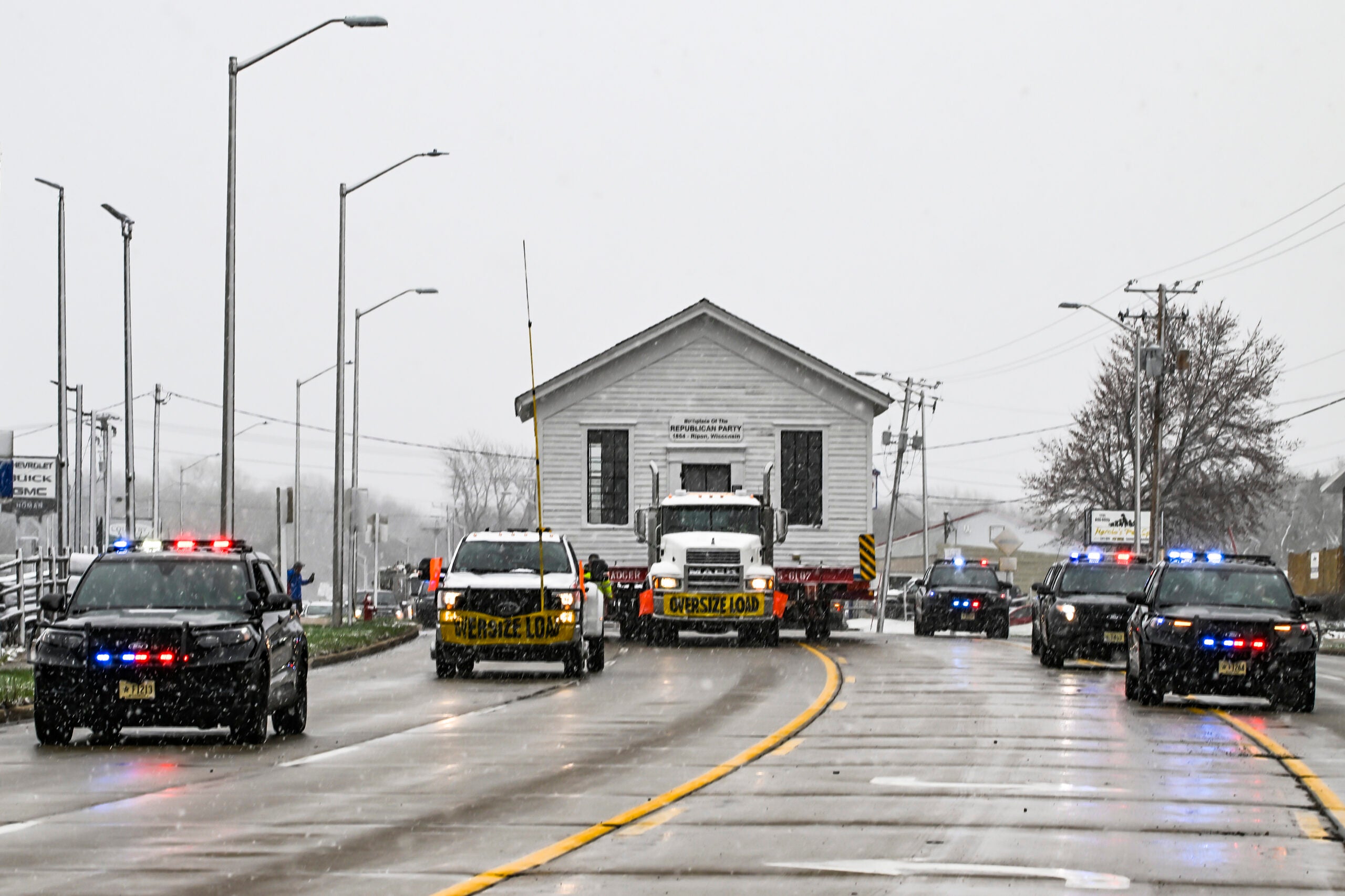 The Little White Schoolhouse in Ripon moved to a new location Monday, shifted on the back of a truck from Blackburn Street, near the city’s downtown, to West Fond du Lac Street, a commercial corridor that connects Ripon with the tourist town of Green Lake.