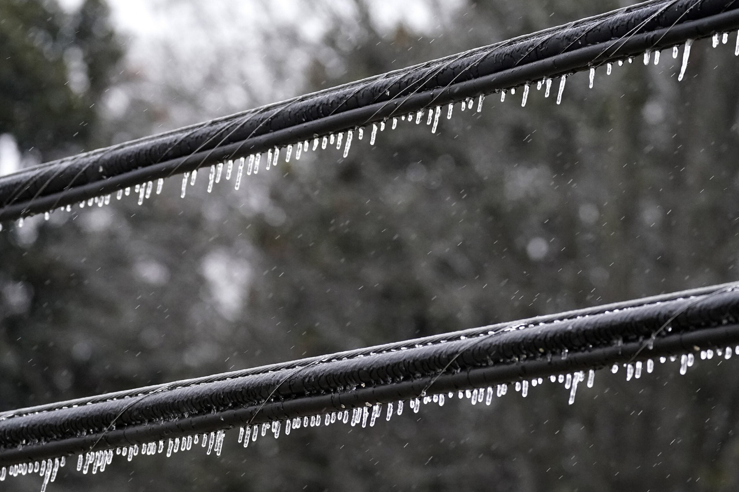 Ice forms on power lines as freezing rain accumulates