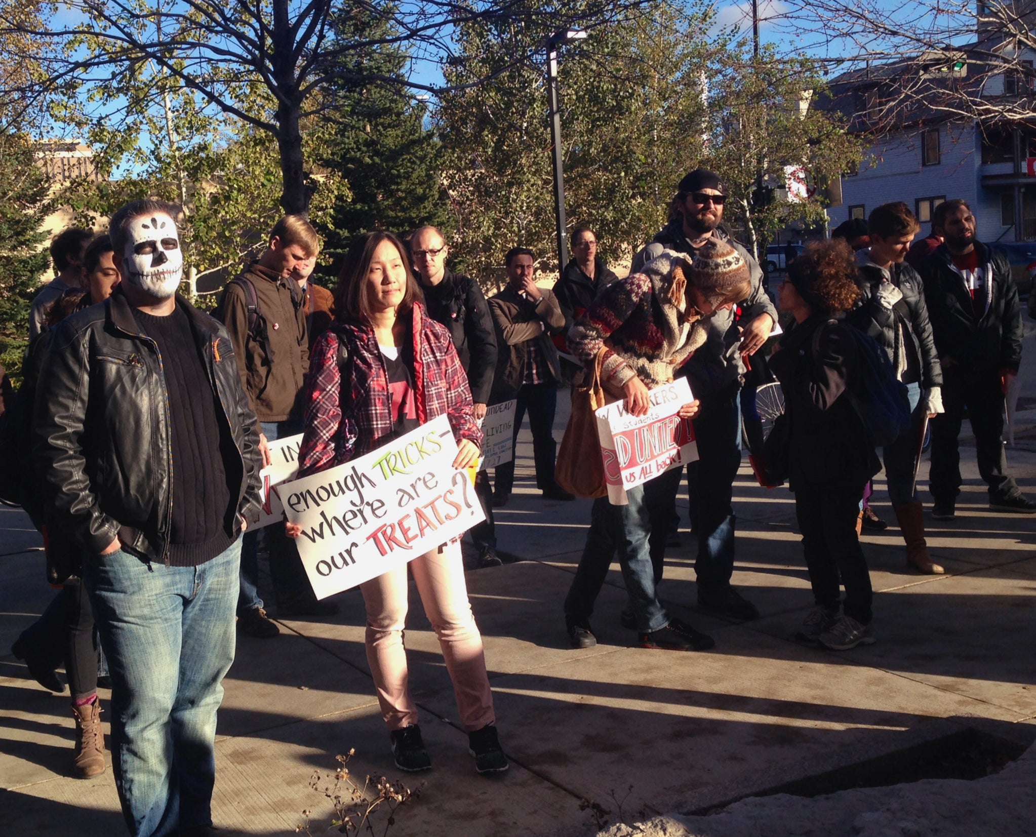 The protesters say that increased student fees and health care costs have contributed to smaller pay checks in recent years. Peters said more than 400 workers at the university, working jobs in food service, gardening, cleaning and as animal lab technicians, don’t make a “living wage.”