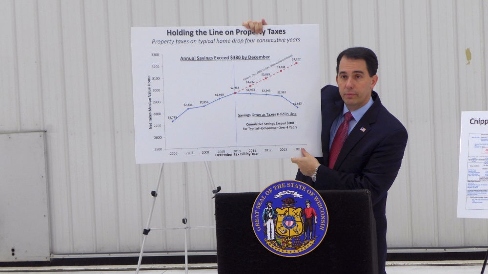 Walker flew to five different airports armed with charts showing the average property taxes for a typical Wisconsin family over the past eight years. Since he took office, Walker said he and the Legislature have worked hard to cut property taxes on a typical Wisconsin home by $144. He said they’re still not finished.