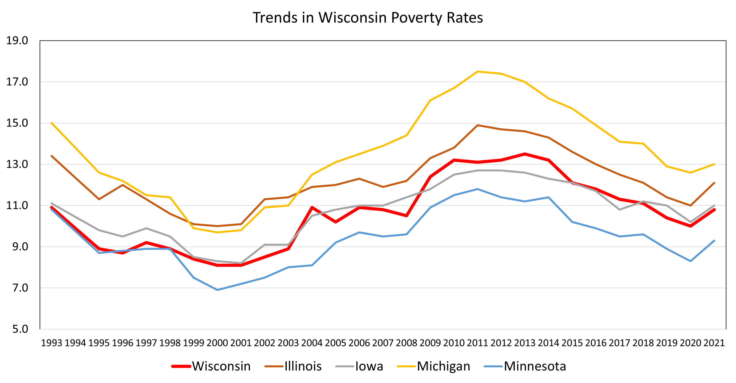 Poverty rates in Wisconsin continued on a downward trend from 2014 to 2020, bottoming out around about 10 percent, before creeping back up in 2021 to just under 11 percent, the report said.