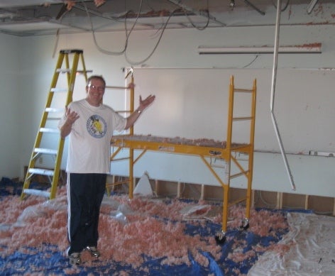 Dave Beringer, the administrator of Wisconsin Valley Lutheran High School in Mosinee, carries a step ladder for repair crews, negotiating a path through a noisy hallway lined with high powered fans.