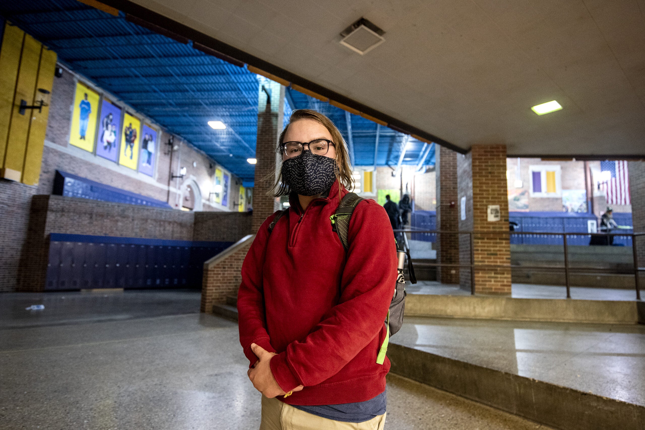Tamaya Travis, a senior at Madison East High School, stands inside the school following a rally to bring attention to climate change Tuesday, April 22, 2022, in Madison, Wis. Angela Major/WPR