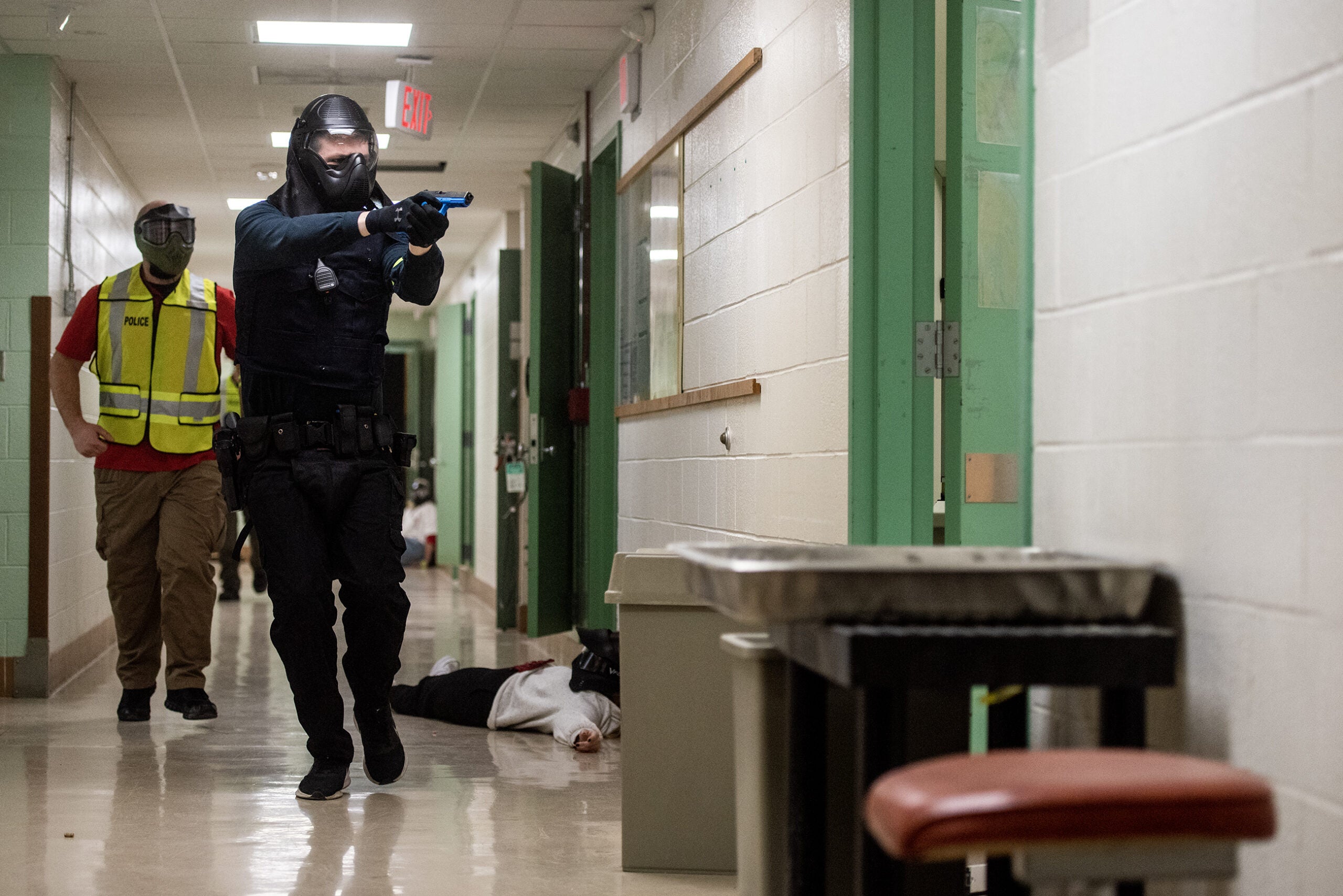 In a small lab to the left of the hallway, an officer playing the shooter is waiting with yet another wounded individual. When the two meet, there are shouts and a rapid volley of gunfire from the simunition pistols. This is just one of multiple scenarios each officer is drilled on this April morning.