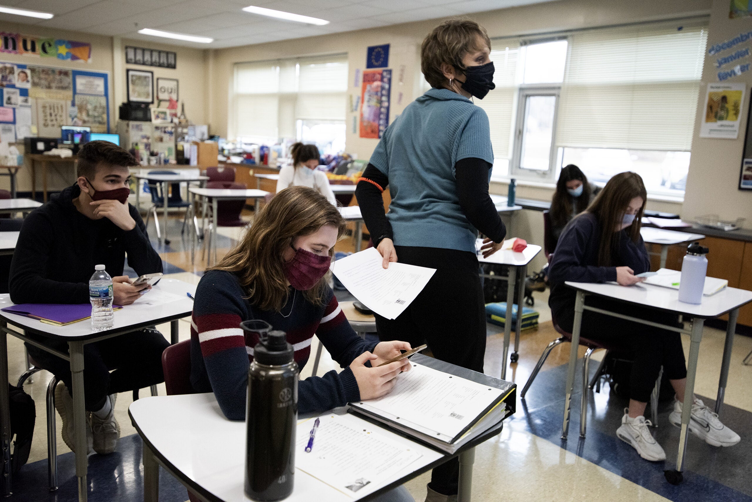 French students at Brookfield East High School participate in an online quiz game with students attending virtually Monday, March 15, 2021, in Brookfield, Wis. Angela Major/WPR