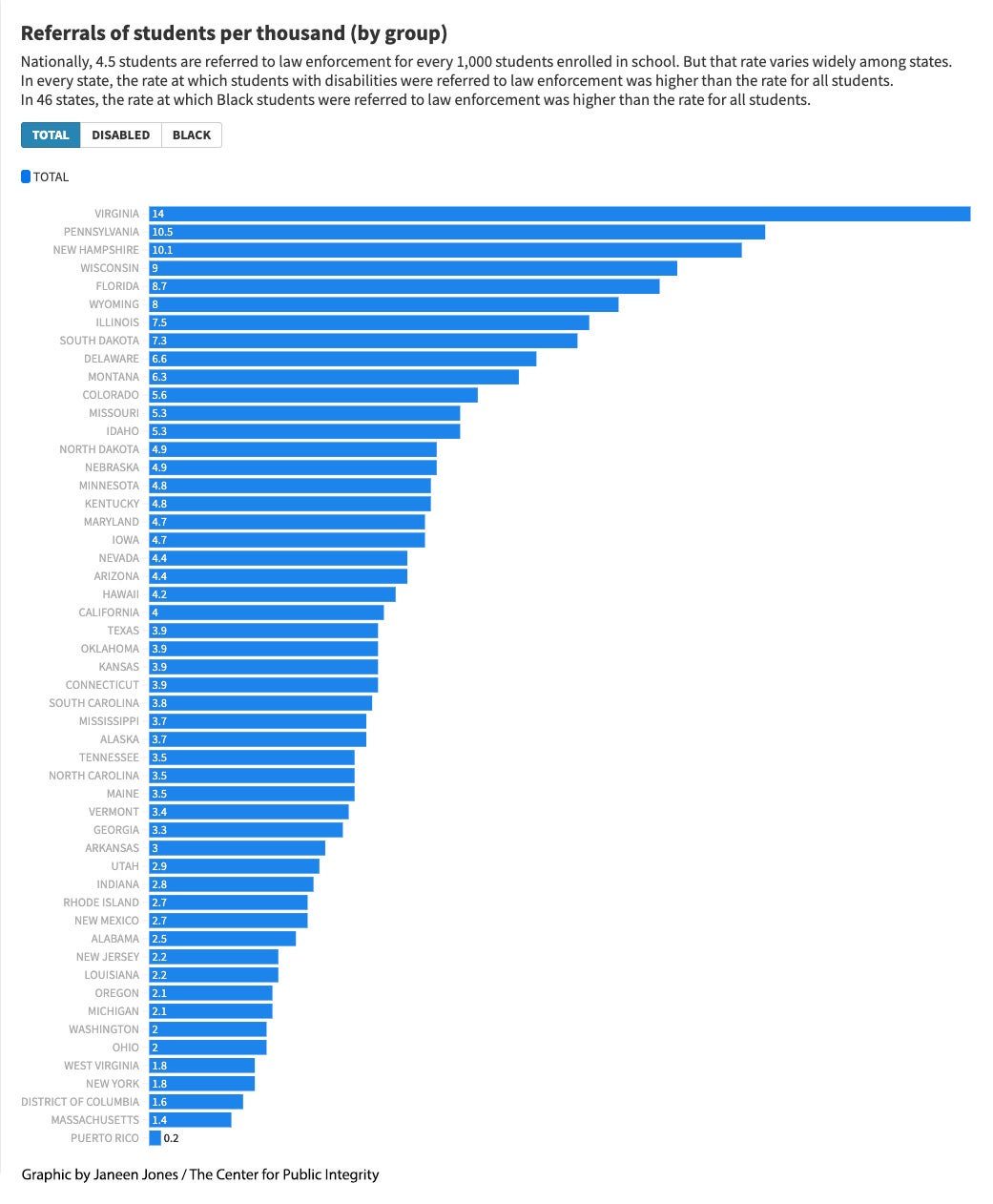 The repercussions ripple through communities in urban, suburban and rural areas alike. In 31 states as well as D.C., Black students were referred to law enforcement at more than twice the rate of white students, the Center for Public Integrity analysis found.