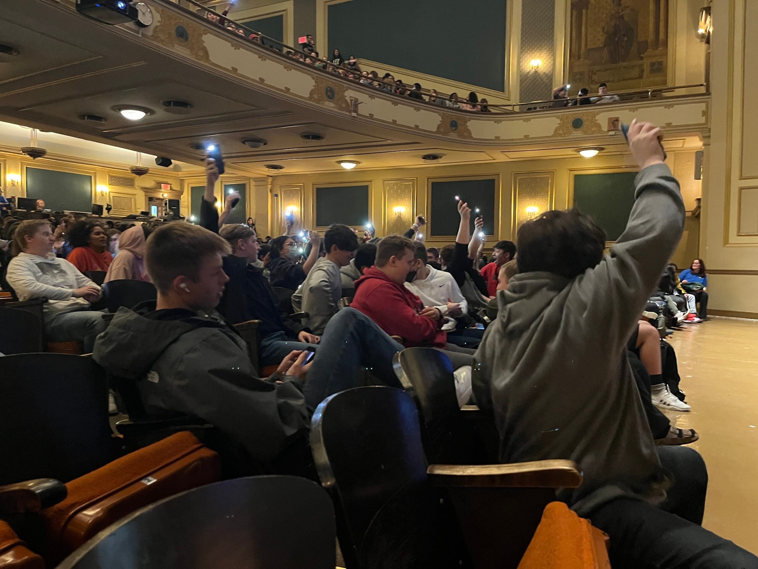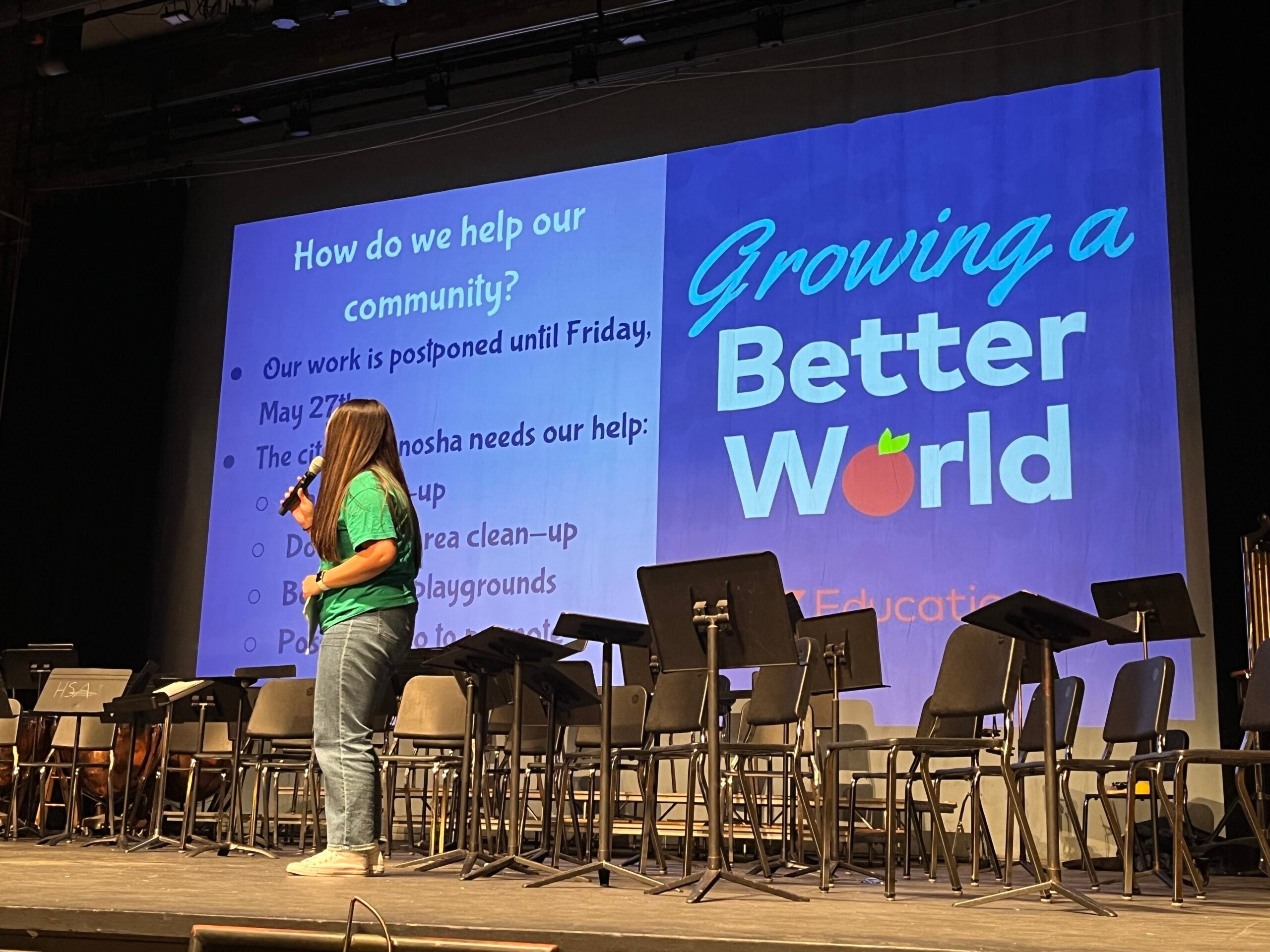 With their outdoor activities postponed, students from the Kenosha schools instead gathered in the auditorium at Harborside to celebrate their schools and talk about how to improve their community. They rocked out to the 2010 version of “We Are The World,” — the students screamed with delight when they recognized younger versions of modern celebrities, and high schoolers turned on their phone flashlights to sway along with the music, in the style of concertgoers waving lighters.