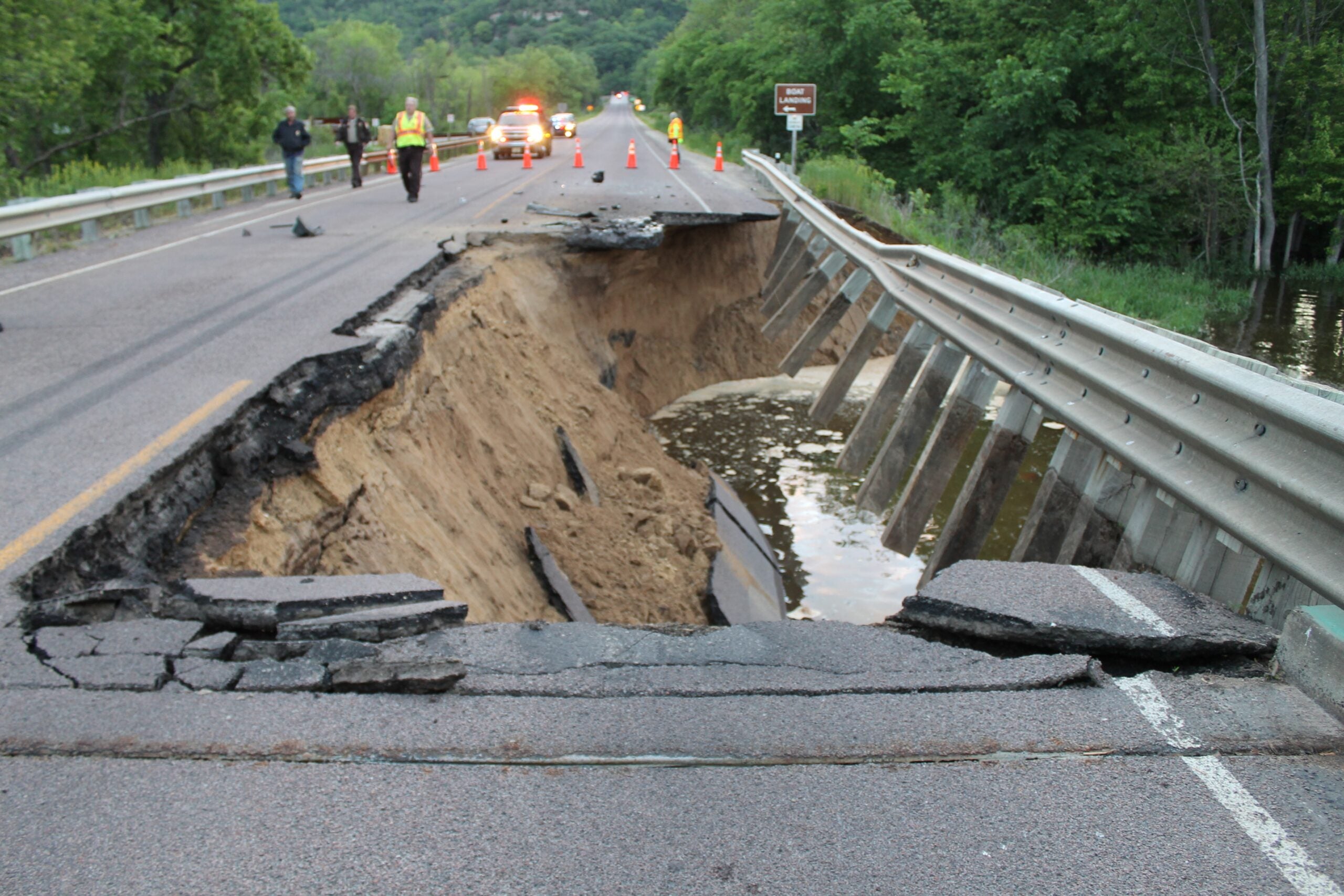 Crawford County Highway Commissioner Dennis Pelock said around 75 feet of the highway’s eastbound lane fell into the river after the embankment was compromised by flooding.