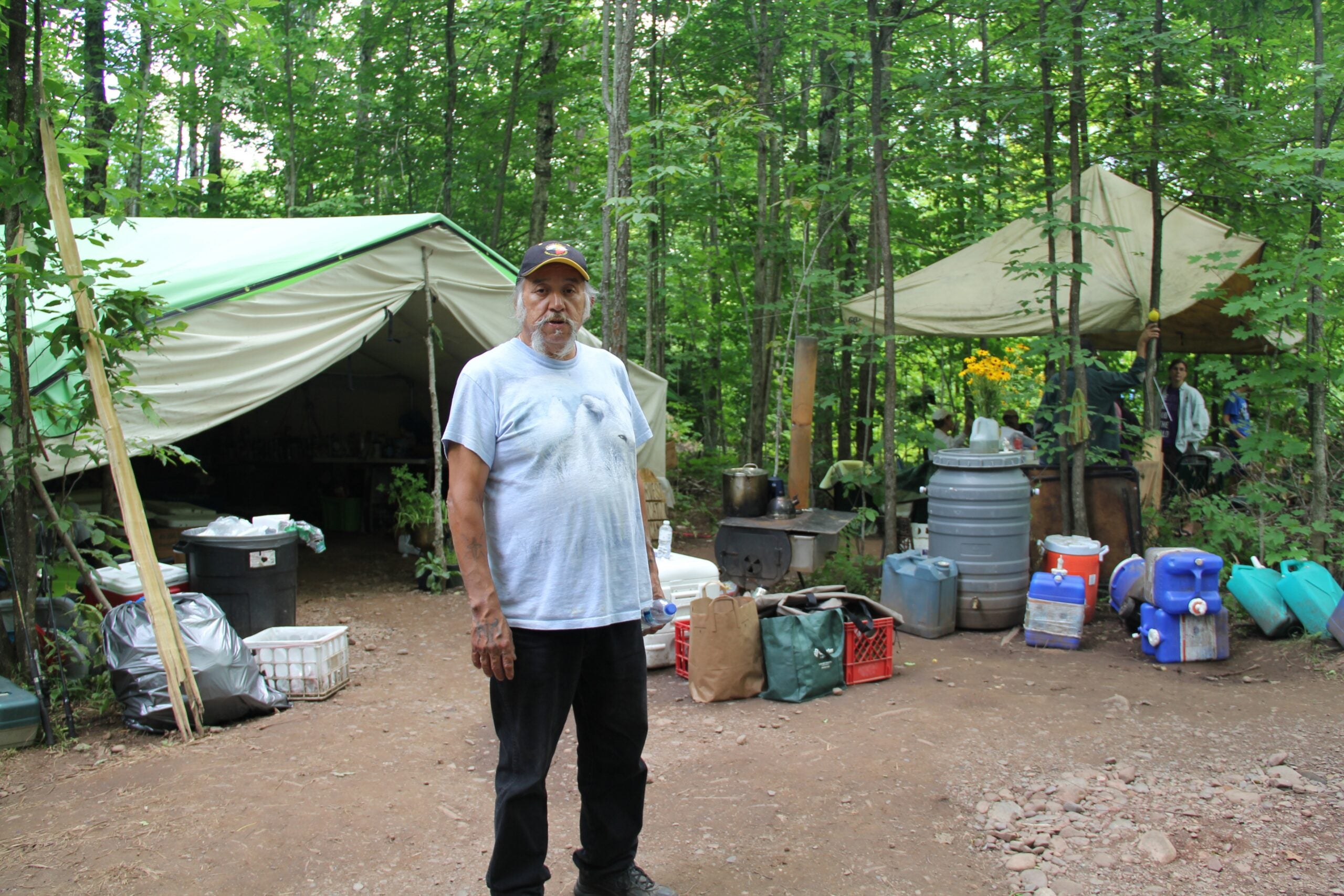 Just off a gravel road in the woods southwest of Hurley, LCO member and camp manager Mel Gaspar welcomes a group of visitors. Gaspar helped set up the camp earlier this year on property that was long ago occupied by Native Americans, but is now Iron County forestland.