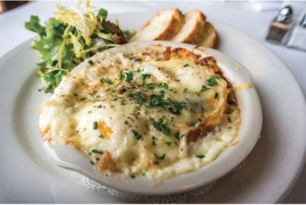 - Served with sliced baguette, cut on a bias, and a salad of mixed field greens in citrus vinaigrette.