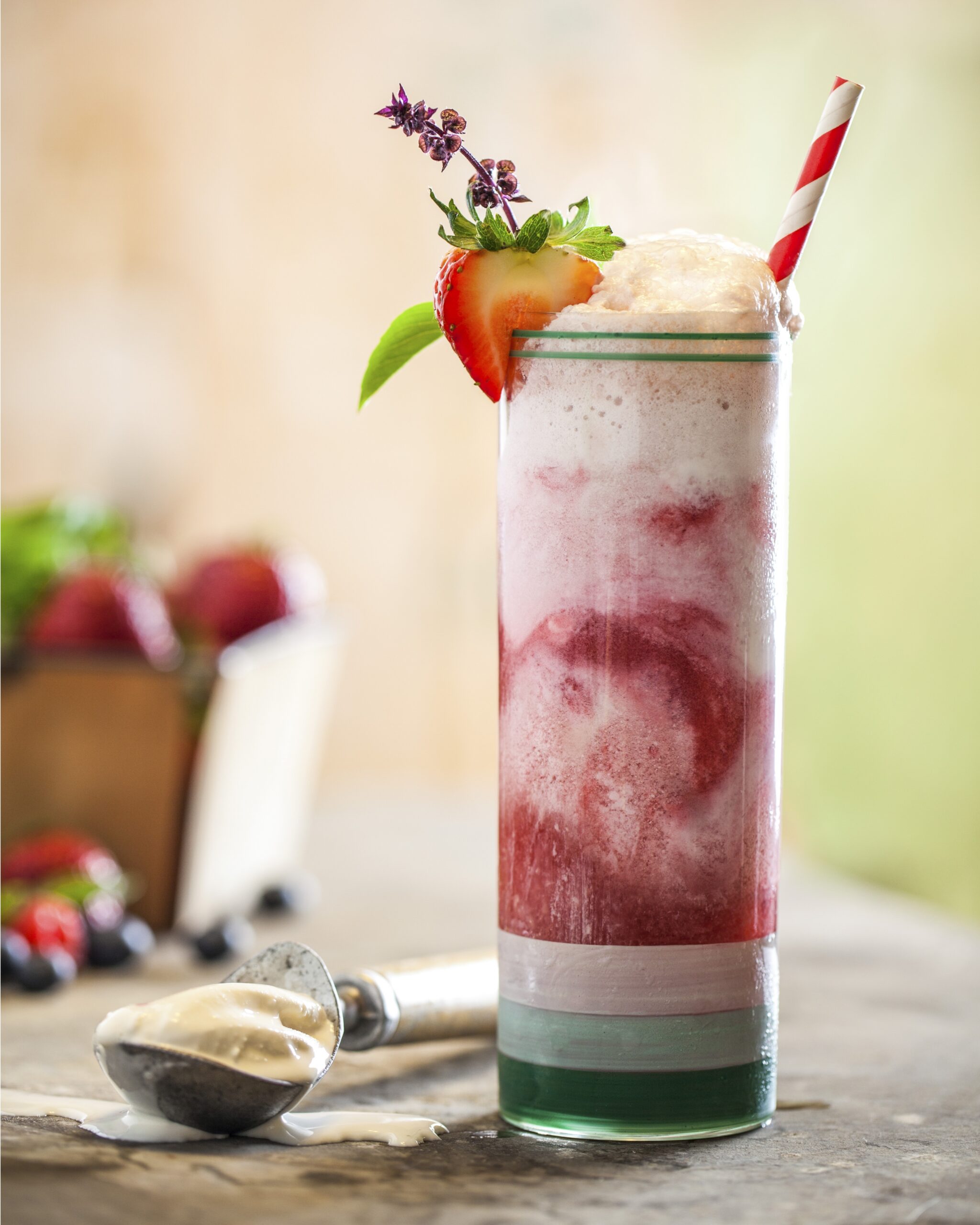 For Basil Berry Float, remove frozen berry mixture and ice cream from freezer and let sit at room temperature for 15 minutes. Spoon four large spoonfuls of berry mixture into four tall Collins glasses, then four large spoonfuls of ice cream. Repeat once more. Top with lemon-lime soda, fresh basil sprig and a strawberry. Serve immediately.