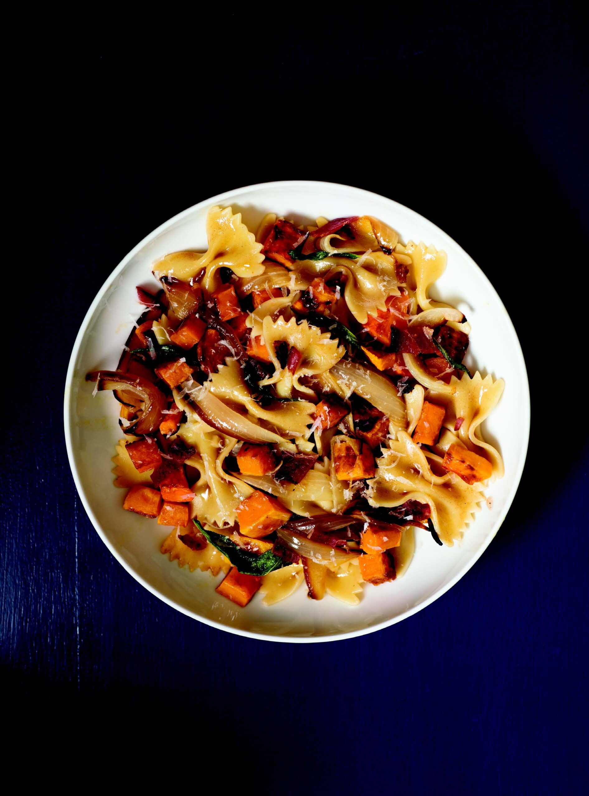 5. Add the squash and onions to the pasta, then pour the butter over the bowl, tossing to coat the pasta and vegetables. Crumble the bacon over the pasta and top with the crispy sage leaves and the cheese. Pour enough pasta water over the cheese to create a light sauce. Finish with a bit more salt and lots of freshly ground pepper.