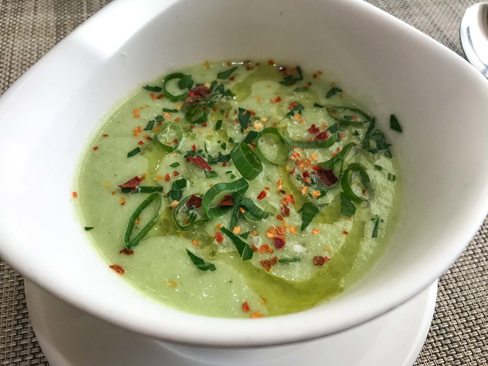 - Season the soup again just before serving. Pour the soup into bowls. Garnish with the finely diced cucumber, red onion and a drizzle of olive oil and serve.