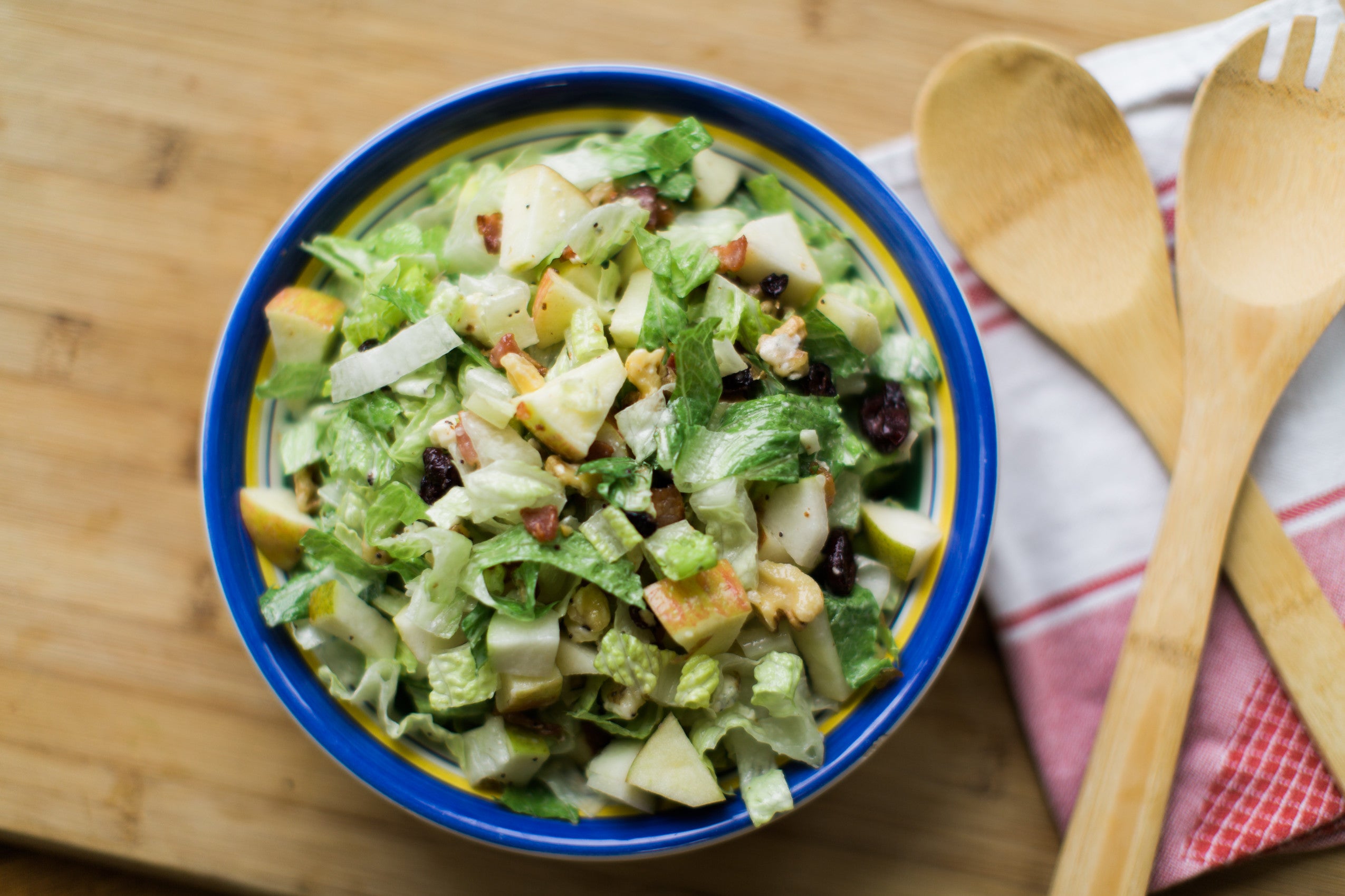 - Place lettuce in a large bowl and then add the pear, apple, bacon, walnuts, dried cranberries, and Gorgonzola cheese, and toss them well.