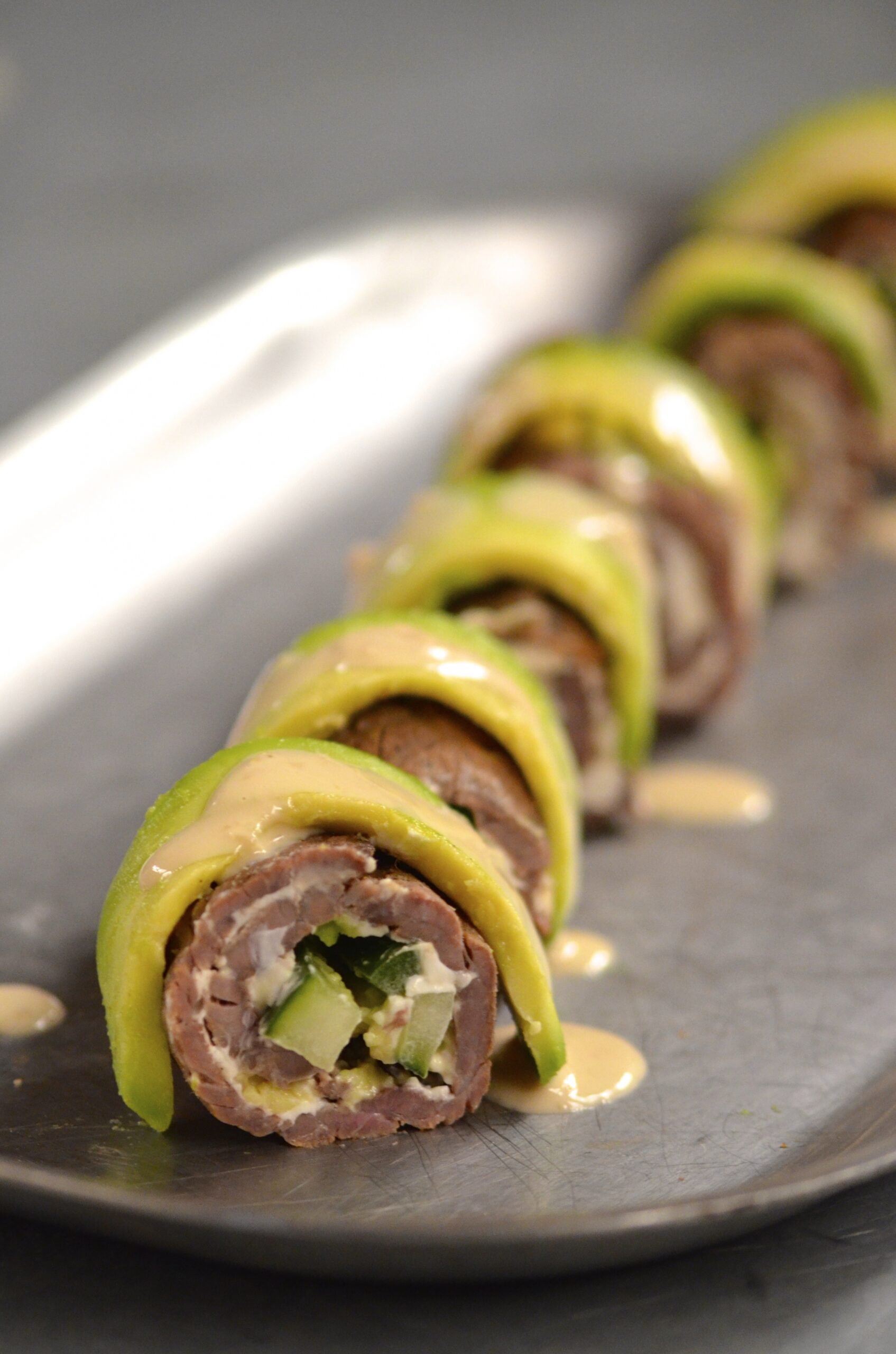 Note from Kent Rollins: Hold the horses, ’cause this is an unlikely pair. Ever since Shannon got me hooked on sushi, it’s been one of my favorites, but I wanted to make it cowboy style. Using thin steaks instead of rice beefs up the protein in my sushi. The fresh flavors of cucumber and avocado bring out the more traditional side of sushi. Tanoshimu — enjoy!
