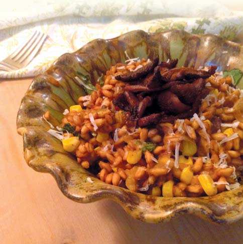 - While farro is cooking, sauté the mushrooms in the unsalted butter. At the end of cooking the farro, stir in half of the mushrooms, the corn and the goat cheese. The goat cheese should melt within the farro making the dish slightly creamy.