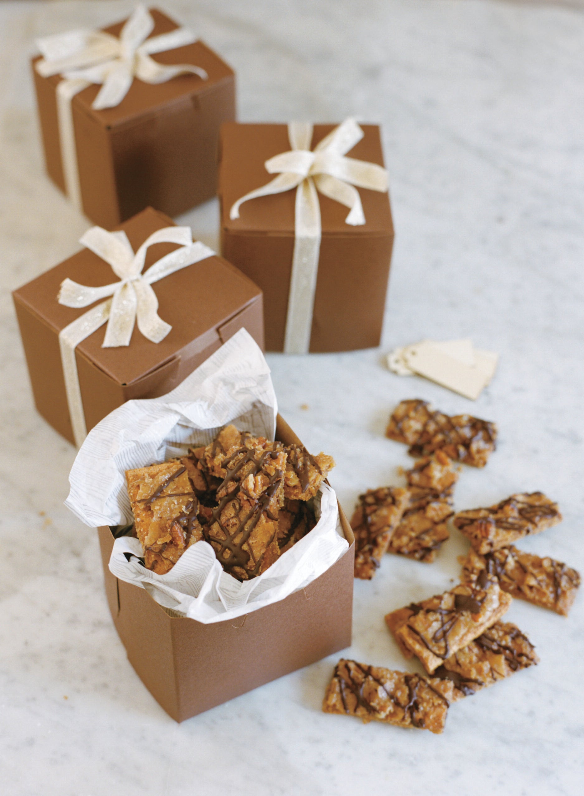 Line each box with tissue paper. Place the toffee in the box and seal. Cut a long length of ribbon, and tiei n a bow around the box. Cut the loops of the bow to the same size as the extra ribbon.