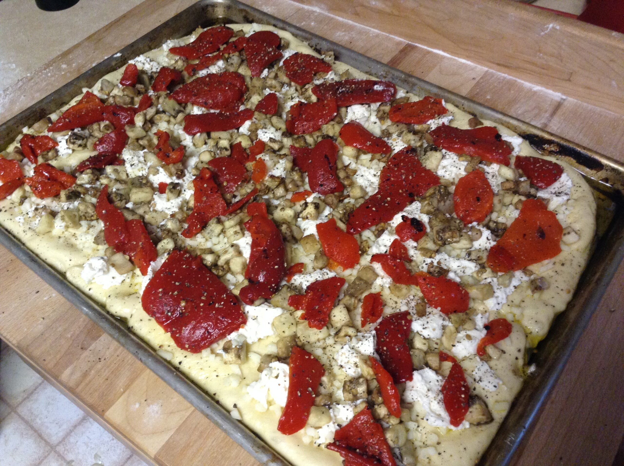 5. Cover dough on baking sheet tightly with plastic wrap and let sit in a warm place (but not too warm!—about 70° is ideal for yeast to grow) until it is puffed and full of air bubbles, 30–40 minutes.