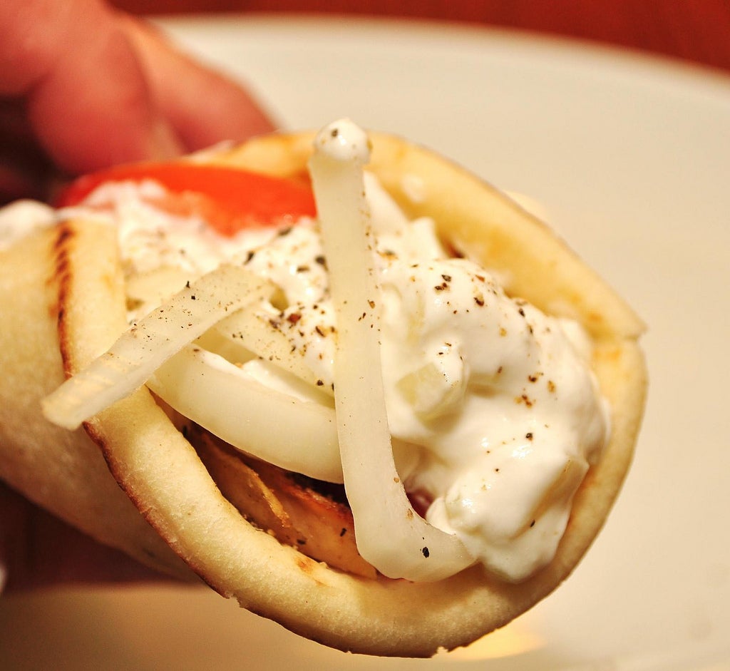 3. Warm and arrange the pitas on a plate. Top pitas with chicken mixture. Add mixture of diced tomatoes and cucumbers. Spoon some yogurt sauce over chicken.